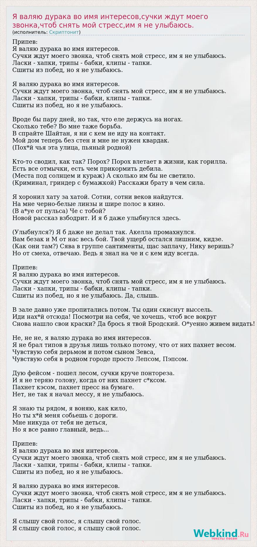 Припев: Я валяю дурака во имя интересов. Сучки ждут моего звонка, чтоб снять мой стресс, им я не улыбаюсь. Ласки - хапки, трипы - бабки, клипы - тапки. Сшиты из побед, но я не улыбаюсь. Я валяю дурака во имя интересов. Сучки ждут моего звонка, чтоб снять мой стресс, им я не улыбаюсь. Ласки - хапки, трипы - бабки, клипы - тапки. Сшиты из побед, но я не улыбаюсь. Вроде бы пару дней, но так, что еле держусь на ногах. Сколько тебе? Во мне таже борьба. В спрайте Шайтан, я ни с кем не иду на контакт. Мой дом теперь без стен и мне не нужен квардак. (Пох*й чья эта улица, пьяный родной) Кто-то сводил, как так? Порох? Порох влетает в жизни, как горилла. Есть все отмычки, есть чем прикормить дебила. (Места под солнцем и кураж) А сколько им бы не светило. (Криминал, гриндер с бумажкой) Расскажи брату в чем сила. Я хоронил хату за хатой. Сотни, сотни веков найдутся. На мне черно-белые линзы и шире полос в кино. (В а*уе от пульса) Че с тобой? Новой рассказ взбодрит. И я б даже улыбнулся здесь. (Улыбнулся?) Я б даже не делал так. Акелла промахнулся. Вам безак и М от нас весь бой. Твой ущерб остался лишним, кидзе. (Как они там?) Сява в группе сантименты, щас заплачу, Нику веришь? Но от смеха, отвечаю. Ведь я знал на че и с кем иду всегда. Припев: Я валяю дурака во имя интересов. Сучки ждут моего звонка, чтоб снять мой стресс, им я не улыбаюсь. Ласки - хапки, трипы - бабки, клипы - тапки. Сшиты из побед, но я не улыбаюсь. Да, слышь. В зале давно уже пропитались потом. Ты один скиснут выссель. Иди нах*й отсюда! Посмотри на себя, че хочешь, чтоб все вокруг Снова нашло свои краски? Да брось я твой Бродский. О*уенно живем видать! Не, не не, я валяю дурака во имя интересов. Я не брал типов в друзья лишь только потому, что от них пахнет весом. Чувствую себя дерьмом и потом сыном Зевса, Чувствую себя в родном городе просто Лепсом, Пэпсом. Дую фейсом - пошел лесом, сучки круче понтореза. И я не теряю голову, когда от них пахнет с*ксом. Пахнет кэсом, пахнет пресс на бумаге. Нет, не так я начал мессу, я не улыбаюсь. Я знаю ты рядом, я воняю, как кило, Но ты х*й меня собьешь с дороги. Мне никуда от тебя не деться, Но я все равно главный, ведь... Припев: Я валяю дурака во имя интересов. Сучки ждут моего звонка, чтоб снять мой стресс, им я не улыбаюсь. Ласки - хапки, трипы - бабки, клипы - тапки. Сшиты из побед, но я не улыбаюсь. Я валяю дурака во имя интересов. Сучки ждут моего звонка, чтоб снять мой стресс, им я не улыбаюсь. Ласки - хапки, трипы - бабки, клипы - тапки. Сшиты из побед, но я не улыбаюсь. Я слышу свой голос, я слышу свой голос. Я слышу свой голос, я слышу свой голос.