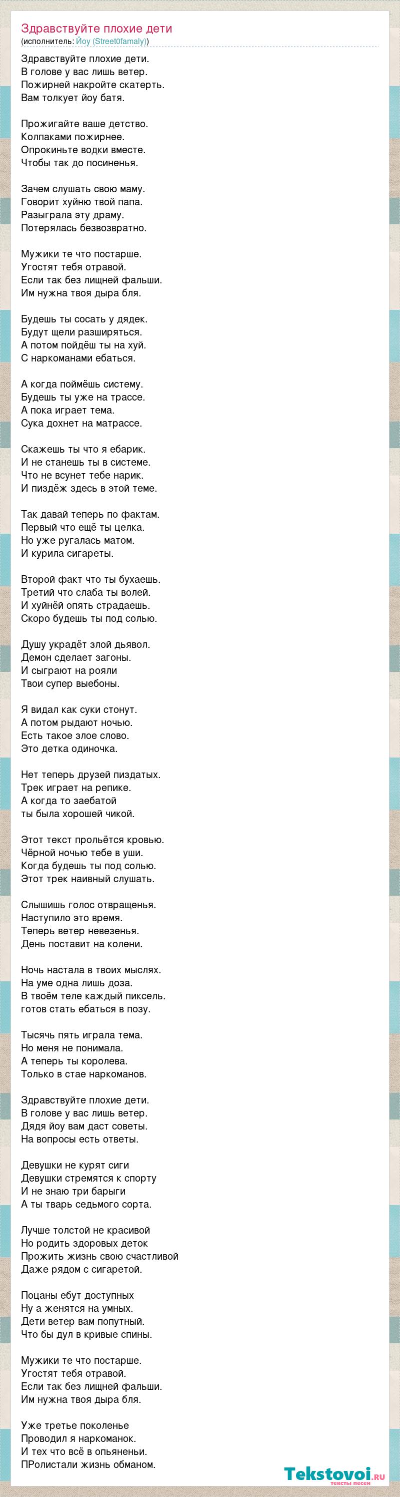 Здравствуйте плохие дети. В голове у вас лишь ветер. Пожирней накройте скатерть. Вам толкует йоу батя. Прожигайте ваше детство. Колпаками пожирнее. Опрокиньте водки вместе. Чтобы так до посиненья. Зачем слушать свою маму. Говорит хуйню твой папа. Разыграла эту драму. Потерялась безвозвратно. Мужики те что постарше. Угостят тебя отравой. Если так без лищней фальши. Им нужна твоя дыра бля. Будешь ты сосать у дядек. Будут щели разширяться. А потом пойдёш ты на хуй. С наркоманами ебаться. А когда поймёшь систему. Будешь ты уже на трассе. А пока играет тема. Сука дохнет на матрассе. Скажешь ты что я ебарик. И не станешь ты в системе. Что не всунет тебе нарик. И пиздёж здесь в этой теме. Так давай теперь по фактам. Первый что ещё ты целка. Но уже ругалась матом. И курила сигареты. Второй факт что ты бухаешь. Третий что слаба ты волей. И хуйнёй опять страдаешь. Скоро будешь ты под солью. Душу украдёт злой дьявол. Демон сделает загоны. И сыграют на рояли Твои супер выебоны. Я видал как суки стонут. А потом рыдают ночью. Есть такое злое слово. Это детка одиночка. Нет теперь друзей пиздатых. Трек играет на репике. А когда то заебатой ты была хорошей чикой. Этот текст прольётся кровью. Чёрной ночью тебе в уши. Когда будешь ты под солью. Этот трек наивный слушать. Слышишь голос отвращенья. Наступило это время. Теперь ветер невезенья. День поставит на колени. Ночь настала в твоих мыслях. На уме одна лишь доза. В твоём теле каждый пиксель. готов стать ебаться в позу. Тысячь пять играла тема. Но меня не понимала. А теперь ты королева. Только в стае наркоманов. Здравствуйте плохие дети. В голове у вас лишь ветер. Дядя йоу вам даст советы. На вопросы есть ответы. Девушки не курят сиги Девушки стремятся к спорту И не знаю три барыги А ты тварь седьмого сорта. Лучше толстой не красивой Но родить здоровых деток Прожить жизнь свою счастливой Даже рядом с сигаретой. Поцаны ебут доступных Ну а женятся на умных. Дети ветер вам попутный. Что бы дул в кривые спины. Мужики те что постарше. Угостят тебя отравой. Если так без лищней фальши. Им нужна твоя дыра бля. Уже третье поколенье Проводил я наркоманок. И тех что всё в опьяненьи. ПРолистали жизнь обманом.