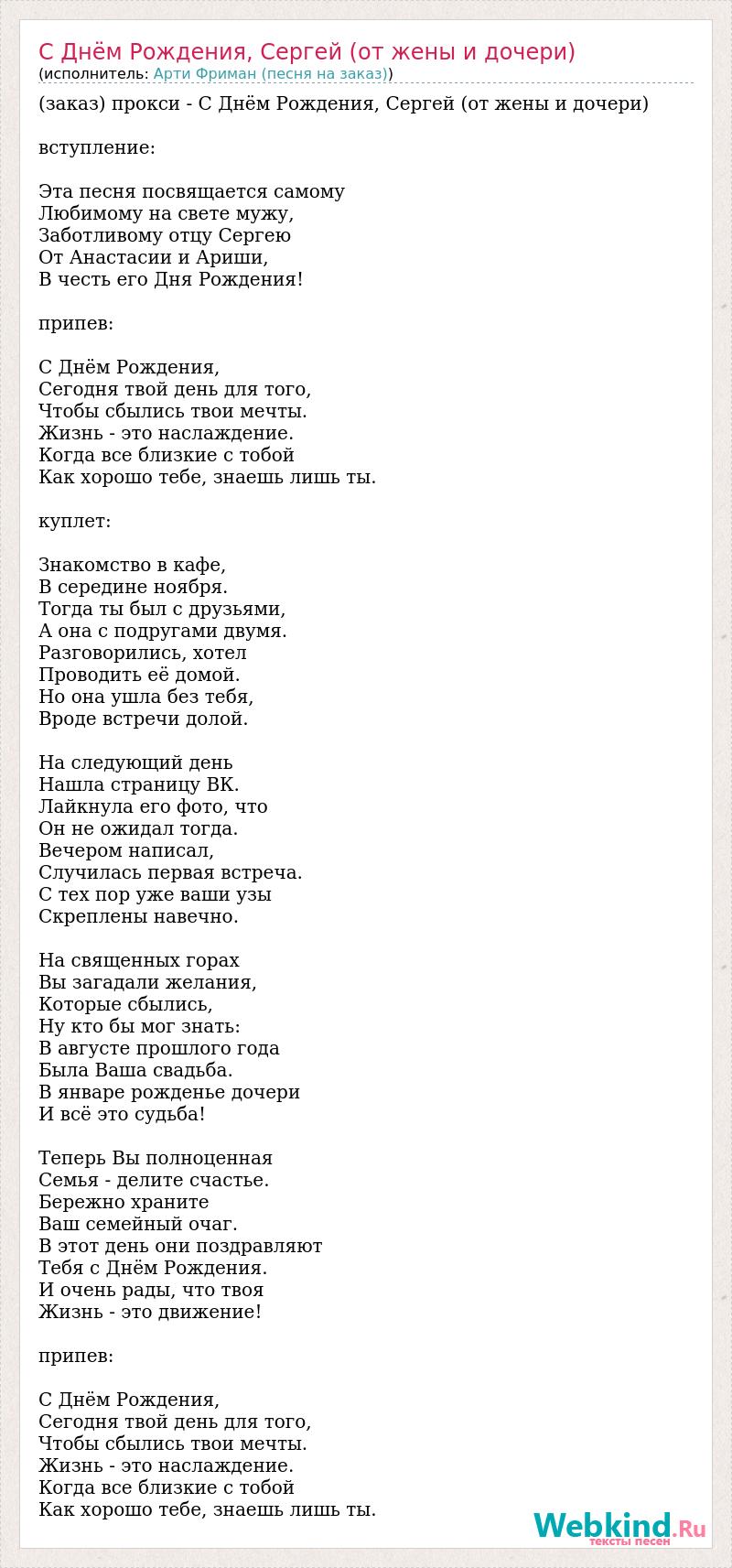 (заказ) прокси - С Днём Рождения, Сергей (от жены и дочери) вступление: Эта песня посвящается самому Любимому на свете мужу, Заботливому отцу Сергею От Анастасии и Ариши, В честь его Дня Рождения! припев: С Днём Рождения, Сегодня твой день для того, Чтобы сбылись твои мечты. Жизнь - это наслаждение. Когда все близкие с тобой Как хорошо тебе, знаешь лишь ты. куплет: Знакомство в кафе, В середине ноября. Тогда ты был с друзьями, А она с подругами двумя. Разговорились, хотел Проводить её домой. Но она ушла без тебя, Вроде встречи долой. На следующий день Нашла страницу ВК. Лайкнула его фото, что Он не ожидал тогда. Вечером написал, Случилась первая встреча. С тех пор уже ваши узы Скреплены навечно. На священных горах Вы загадали желания, Которые сбылись, Ну кто бы мог знать: В августе прошлого года Была Ваша свадьба. В январе рожденье дочери И всё это судьба! Теперь Вы полноценная Семья - делите счастье. Бережно храните Ваш семейный очаг. В этот день они поздравляют Тебя с Днём Рождения. И очень рады, что твоя Жизнь - это движение! припев: С Днём Рождения, Сегодня твой день для того, Чтобы сбылись твои мечты. Жизнь - это наслаждение. Когда все близкие с тобой Как хорошо тебе, знаешь лишь ты.