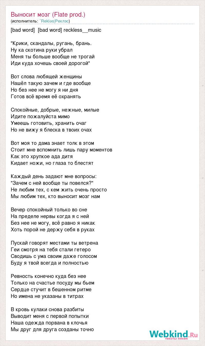 [bad word] [bad word] reckless__music "Крики, скандалы, ругань, брань. Ну ка скотина руки убрал Меня ты больше вообще не трогай Иди куда хочешь своей дорогой" Вот слова любящей женщины Нашёл такую зачем и где вообще Но без нее не могу я ни дня Готов всё время её охранять Спокойные, добрые, нежные, милые Идите пожалуйста мимо Умеешь готовить, хранить очаг Но не вижу я блеска в твоих очах Вот моя то дама знает толк в этом Стоит мне вспомнить лишь пару моментов Как это хрупкое ада дитя Кидает ножи, но глаза то блестят Каждый день задают мне вопросы: "Зачем с ней вообще ты повелся?" Не любим тех, с кем жить очень просто Мы любим тех, кто выносит мозг нам Вечер спокойный только во сне На пределе нервы когда я с ней Без нее не могу, всё равно я никак Хоть порой не держу себя в руках Пускай говорят местами ты ветрена Геи смотря на тебя стали гетеро Сводишь с ума своим даже голосом Буду я твой всегда и полностью Ревность конечно куда без нее Только на счастье посуду мы бьем Сердце стучит в бешенном ритме Но имена не указаны в титрах В кровь кулаки снова разбиты Выводит меня с первой попытки Наша одежда порвана в клочья Мы друг для друга созданы точно