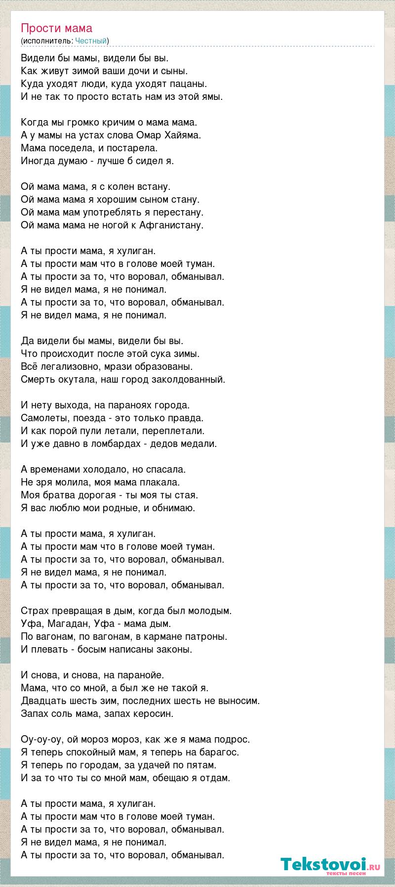 Видели бы мамы, видели бы вы. Как живут зимой ваши дочи и сыны. Куда уходят люди, куда уходят пацаны. И не так то просто встать нам из этой ямы. Когда мы громко кричим о мама мама. А у мамы на устах слова Омар Хайяма. Мама поседела, и постарела. Иногда думаю - лучше б сидел я. Ой мама мама, я с колен встану. Ой мама мама я хорошим сыном стану. Ой мама мам употреблять я перестану. Ой мама мама не ногой к Афганистану. А ты прости мама, я хулиган. А ты прости мам что в голове моей туман. А ты прости за то, что воровал, обманывал. Я не видел мама, я не понимал. А ты прости за то, что воровал, обманывал. Я не видел мама, я не понимал. Да видели бы мамы, видели бы вы. Что происходит после этой сука зимы. Всё легализовно, мрази образованы. Смерть окутала, наш город заколдованный. И нету выхода, на параноях города. Самолеты, поезда - это только правда. И как порой пули летали, переплетали. И уже давно в ломбардах - дедов медали. А временами холодало, но спасала. Не зря молила, моя мама плакала. Моя братва дорогая - ты моя ты стая. Я вас люблю мои родные, и обнимаю. А ты прости мама, я хулиган. А ты прости мам что в голове моей туман. А ты прости за то, что воровал, обманывал. Я не видел мама, я не понимал. А ты прости за то, что воровал, обманывал. Страх превращая в дым, когда был молодым. Уфа, Магадан, Уфа - мама дым. По вагонам, по вагонам, в кармане патроны. И плевать - босым написаны законы. И снова, и снова, на паранойе. Мама, что со мной, а был же не такой я. Двадцать шесть зим, последних шесть не выносим. Запах соль мама, запах керосин. Оу-оу-оу, ой мороз мороз, как же я мама подрос. Я теперь спокойный мам, я теперь на барагос. Я теперь по городам, за удачей по пятам. И за то что ты со мной мам, обещаю я отдам. А ты прости мама, я хулиган. А ты прости мам что в голове моей туман. А ты прости за то, что воровал, обманывал. Я не видел мама, я не понимал. А ты прости за то, что воровал, обманывал.