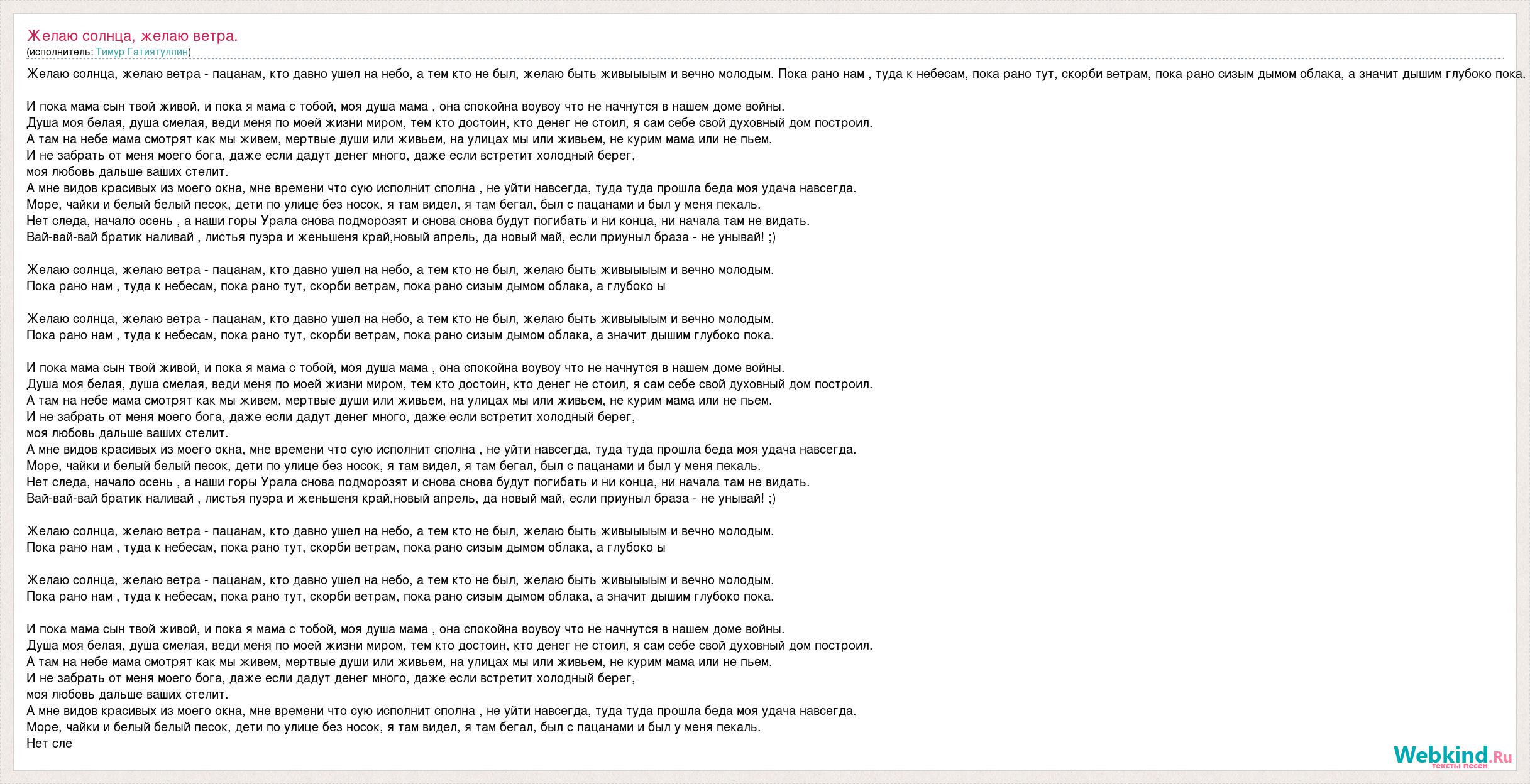 Желаю солнца, желаю ветра - пацанам, кто давно ушел на небо, а тем кто не был, желаю быть живыыыым и вечно молодым. Пока рано нам , туда к небесам, пока рано тут, скорби ветрам, пока рано сизым дымом облака, а значит дышим глубоко пока. И пока мама сын твой живой, и пока я мама с тобой, моя душа мама , она спокойна воувоу что не начнутся в нашем доме войны. Душа моя белая, душа смелая, веди меня по моей жизни миром, тем кто достоин, кто денег не стоил, я сам себе свой духовный дом построил. А там на небе мама смотрят как мы живем, мертвые души или живьем, на улицах мы или живьем, не курим мама или не пьем. И не забрать от меня моего бога, даже если дадут денег много, даже если встретит холодный берег, моя любовь дальше ваших стелит. А мне видов красивых из моего окна, мне времени что сую исполнит сполна , не уйти навсегда, туда туда прошла беда моя удача навсегда. Море, чайки и белый белый песок, дети по улице без носок, я там видел, я там бегал, был с пацанами и был у меня пекаль. Нет следа, начало осень , а наши горы Урала снова подморозят и снова снова будут погибать и ни конца, ни начала там не видать. Вай-вай-вай братик наливай , листья пуэра и женьшеня край,новый апрель, да новый май, если приуныл браза - не унывай! ;) Желаю солнца, желаю ветра - пацанам, кто давно ушел на небо, а тем кто не был, желаю быть живыыыым и вечно молодым. Пока рано нам , туда к небесам, пока рано тут, скорби ветрам, пока рано сизым дымом облака, а глубоко ы Желаю солнца, желаю ветра - пацанам, кто давно ушел на небо, а тем кто не был, желаю быть живыыыым и вечно молодым. Пока рано нам , туда к небесам, пока рано тут, скорби ветрам, пока рано сизым дымом облака, а значит дышим глубоко пока. И пока мама сын твой живой, и пока я мама с тобой, моя душа мама , она спокойна воувоу что не начнутся в нашем доме войны. Душа моя белая, душа смелая, веди меня по моей жизни миром, тем кто достоин, кто денег не стоил, я сам себе свой духовный дом построил. А там на небе мама смотрят как мы живем, мертвые души или живьем, на улицах мы или живьем, не курим мама или не пьем. И не забрать от меня моего бога, даже если дадут денег много, даже если встретит холодный берег, моя любовь дальше ваших стелит. А мне видов красивых из моего окна, мне времени что сую исполнит сполна , не уйти навсегда, туда туда прошла беда моя удача навсегда. Море, чайки и белый белый песок, дети по улице без носок, я там видел, я там бегал, был с пацанами и был у меня пекаль. Нет следа, начало осень , а наши горы Урала снова подморозят и снова снова будут погибать и ни конца, ни начала там не видать. Вай-вай-вай братик наливай , листья пуэра и женьшеня край,новый апрель, да новый май, если приуныл браза - не унывай! ;) Желаю солнца, желаю ветра - пацанам, кто давно ушел на небо, а тем кто не был, желаю быть живыыыым и вечно молодым. Пока рано нам , туда к небесам, пока рано тут, скорби ветрам, пока рано сизым дымом облака, а глубоко ы Желаю солнца, желаю ветра - пацанам, кто давно ушел на небо, а тем кто не был, желаю быть живыыыым и вечно молодым. Пока рано нам , туда к небесам, пока рано тут, скорби ветрам, пока рано сизым дымом облака, а значит дышим глубоко пока. И пока мама сын твой живой, и пока я мама с тобой, моя душа мама , она спокойна воувоу что не начнутся в нашем доме войны. Душа моя белая, душа смелая, веди меня по моей жизни миром, тем кто достоин, кто денег не стоил, я сам себ