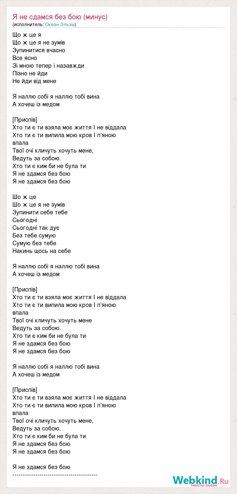 Що ж це я Що ж це я не зумів Зупинитися вчасно Все ясно Зі мною тепер і назавжди Пізно не йди Не йди від мене Я наллю собі я наллю тобі вина А хочеш із медом [Приспів] Хто ти є ти взяла моє життя І не віддала Хто ти є ти випила мою кров І п’яною впала Твої очі кличуть хочуть мене, Ведуть за собою. Хто ти є ким би не була ти Я не здамся без бою Я не здамся без бою Шо ж це Шо ж це я не зумів Зупинити себе тебе Сьогодні Сьогодні так дує Без тебе сумую Сумую без тебе Накинь щось на себе Я наллю собі я наллю тобі вина А хочеш із медом [Приспів] Хто ти є ти взяла моє життя І не віддала Хто ти є ти випила мою кров І п’яною впала Твої очі кличуть хочуть мене Ведуть за собою. Хто ти є ким би не була ти Я не здамся без бою Я не здамся без бою Я наллю собі я наллю тобі вина А хочеш із медом [Приспів] Хто ти є ти взяла моє життя І не віддала Хто ти є ти випила мою кров І п’яною впала Твої очі кличуть хочуть мене, Ведуть за собою. Хто ти є ким би не була ти Я не здамся без бою Я не здамся без бою Я не здамся без бою -----------------------------------------