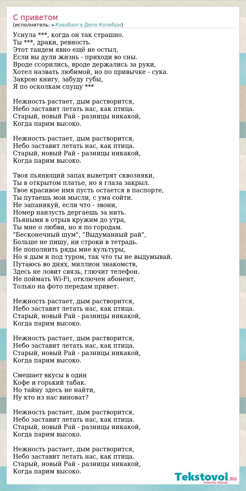 Уснула ***, когда он так страшно. Ты ***, драки, ревность. Этот тандем явно ещё не остыл, Если вы дули жизнь - приходи во сны. Вроде ссорились, вроде держались за руки, Хотел назвать любимой, но по привычке - сука. Закрою книгу, забуду губы, Я по осколкам спущу *** Нежность растает, дым растворится, Небо заставит летать нас, как птица. Старый, новый Рай - разницы никакой, Когда парим высоко. Нежность растает, дым растворится, Небо заставит летать нас, как птица. Старый, новый Рай - разницы никакой, Когда парим высоко. Твоя пьянющий запах выветрят сквозняки, Ты в открытом платье, но я глаза закрыл. Твое красивое имя пусть остается в паспорте, Ты путаешь мои мысли, с ума сойти. Не запаникуй, если что - звони, Номер наизусть дергаешь за нить. Пьяными в отрыв кружим до утра, Ты мне о любви, но я по городам. "Бесконечный шум", "Выдуманный рай", Больше не пишу, ни строки в тетрадь. Не пополнить ряды мне культуры, Но я дым и под туром, так что ты не выдумывай. Путаюсь во днях, миллион знакомств, Здесь не ловит связь, глючит телефон. Не поймать Wi-Fi, отключен абонент, Только на фото передам привет. Нежность растает, дым растворится, Небо заставит летать нас, как птица. Старый, новый Рай - разницы никакой, Когда парим высоко. Нежность растает, дым растворится, Небо заставит летать нас, как птица. Старый, новый Рай - разницы никакой, Когда парим высоко. Смешает вкусы в один Кофе и горький табак. Но тайну здесь не найти, Ну кто из нас виноват? Нежность растает, дым растворится, Небо заставит летать нас, как птица. Старый, новый Рай - разницы никакой, Когда парим высоко. Нежность растает, дым растворится, Небо заставит летать нас, как птица. Старый, новый Рай - разницы никакой, Когда парим высоко.