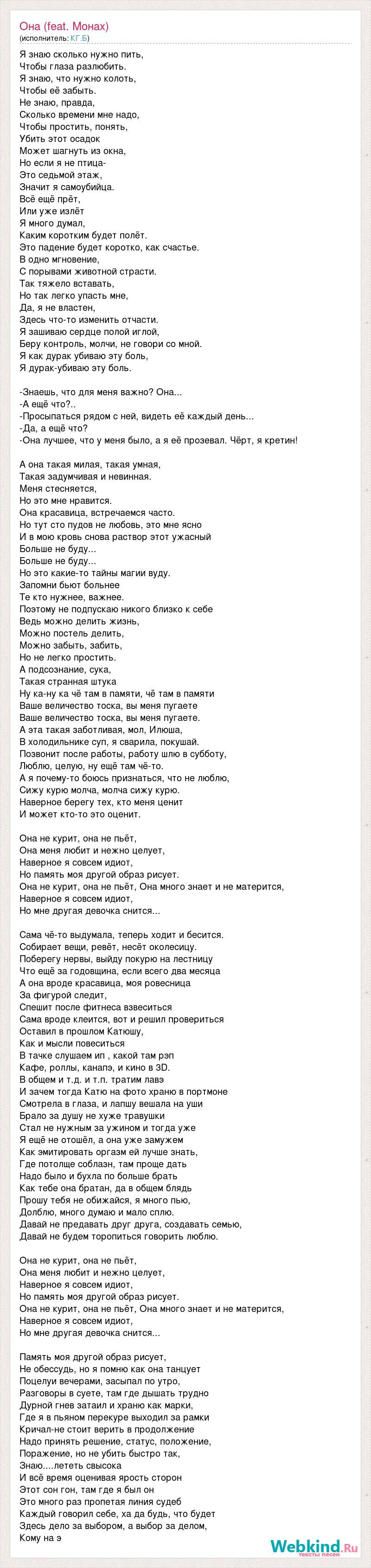 Я знаю сколько нужно пить, Чтобы глаза разлюбить. Я знаю, что нужно колоть, Чтобы её забыть. Не знаю, правда, Сколько времени мне надо, Чтобы простить, понять, Убить этот осадок Может шагнуть из окна, Но если я не птица- Это седьмой этаж, Значит я самоубийца. Всё ещё прёт, Или уже излёт Я много думал, Каким коротким будет полёт. Это падение будет коротко, как счастье. В одно мгновение, С порывами животной страсти. Так тяжело вставать, Но так легко упасть мне, Да, я не властен, Здесь что-то изменить отчасти. Я зашиваю сердце полой иглой, Беру контроль, молчи, не говори со мной. Я как дурак убиваю эту боль, Я дурак-убиваю эту боль. -Знаешь, что для меня важно? Она... -А ещё что?.. -Просыпаться рядом с ней, видеть её каждый день... -Да, а ещё что? -Она лучшее, что у меня было, а я её прозевал. Чёрт, я кретин! А она такая милая, такая умная, Такая задумчивая и невинная. Меня стесняется, Но это мне нравится. Она красавица, встречаемся часто. Но тут сто пудов не любовь, это мне ясно И в мою кровь снова раствор этот ужасный Больше не буду... Больше не буду... Но это какие-то тайны магии вуду. Запомни бьют больнее Те кто нужнее, важнее. Поэтому не подпускаю никого близко к себе Ведь можно делить жизнь, Можно постель делить, Можно забыть, забить, Но не легко простить. А подсознание, сука, Такая странная штука Ну ка-ну ка чё там в памяти, чё там в памяти Ваше величество тоска, вы меня пугаете Ваше величество тоска, вы меня пугаете. А эта такая заботливая, мол, Илюша, В холодильнике суп, я сварила, покушай. Позвонит после работы, работу шлю в субботу, Люблю, целую, ну ещё там чё-то. А я почему-то боюсь признаться, что не люблю, Сижу курю молча, молча сижу курю. Наверное берегу тех, кто меня ценит И может кто-то это оценит. Она не курит, она не пьёт, Она меня любит и нежно целует, Наверное я совсем идиот, Но память моя другой образ рисует. Она не курит, она не пьёт, Она много знает и не матерится, Наверное я совсем идиот, Но мне другая девочка снится... Сама чё-то выдумала, теперь ходит и бесится. Собирает вещи, ревёт, несёт околесицу. Поберегу нервы, выйду покурю на лестницу Что ещё за годовщина, если всего два месяца А она вроде красавица, моя ровесница За фигурой следит, Спешит после фитнеса взвеситься Сама вроде клеится, вот и решил провериться Оставил в прошлом Катюшу, Как и мысли повеситься В тачке слушаем ип , какой там рэп Кафе, роллы, канапэ, и кино в 3D. В общем и т.д. и т.п. тратим лавэ И зачем тогда Катю на фото храню в портмоне Смотрела в глаза, и лапшу вешала на уши Брало за душу не хуже травушки Стал не нужным за ужином и тогда уже Я ещё не отошёл, а она уже замужем Как эмитировать оргазм ей лучше знать, Где потолще соблазн, там проще дать Надо было и бухла по больше брать Как тебе она братан, да в общем блядь Прошу тебя не обижайся, я много пью, Долблю, много думаю и мало сплю. Давай не предавать друг друга, создавать семью, Давай не будем торопиться говорить люблю. Она не курит, она не пьёт, Она меня любит и нежно целует, Наверное я совсем идиот, Но память моя другой образ рисует. Она не курит, она не пьёт, Она много знает и не матерится, Наверное я совсем идиот, Но мне другая девочка снится... Память моя другой образ рисует, Не обессудь, но я помню как она танцует Поцелуи вечерами, засыпал по утро, Разговоры в суете, там где дышать трудно Дурной гнев затаил и храню как марки, Где я в пьяном перекуре выходил за рамк
