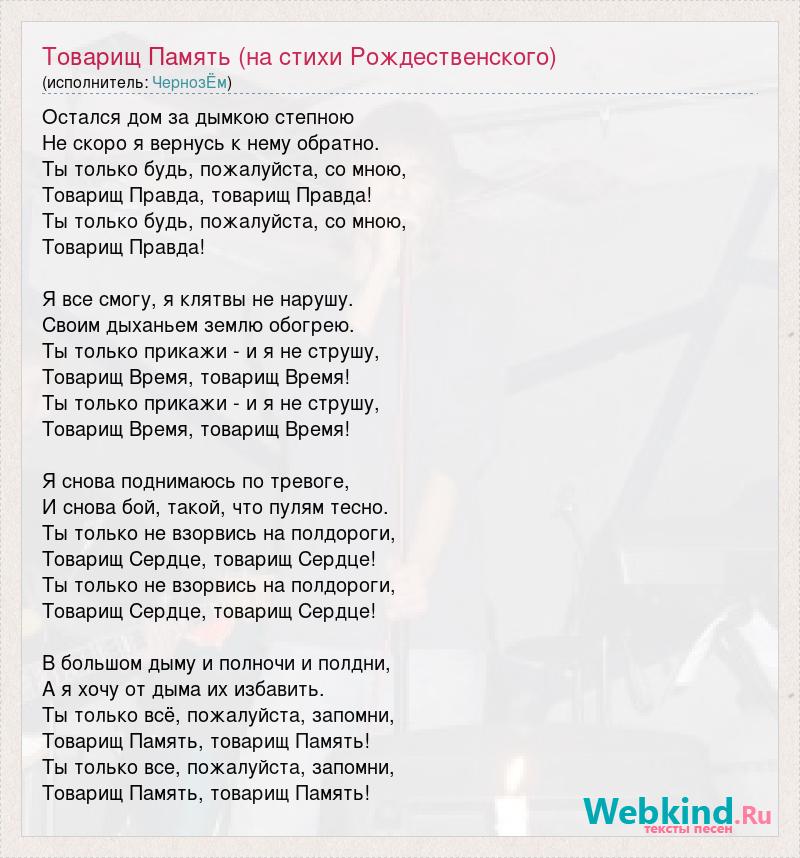 Остался дом за дымкою степною Не скоро я вернусь к нему обратно. Ты только будь, пожалуйста, со мною, Товарищ Правда, товарищ Правда! Ты только будь, пожалуйста, со мною, Товарищ Правда! Я все смогу, я клятвы не нарушу. Своим дыханьем землю обогрею. Ты только прикажи - и я не струшу, Товарищ Время, товарищ Время! Ты только прикажи - и я не струшу, Товарищ Время, товарищ Время! Я снова поднимаюсь по тревоге, И снова бой, такой, что пулям тесно. Ты только не взорвись на полдороги, Товарищ Сердце, товарищ Сердце! Ты только не взорвись на полдороги, Товарищ Сердце, товарищ Сердце! В большом дыму и полночи и полдни, А я хочу от дыма их избавить. Ты только всё, пожалуйста, запомни, Товарищ Память, товарищ Память! Ты только все, пожалуйста, запомни, Товарищ Память, товарищ Память!