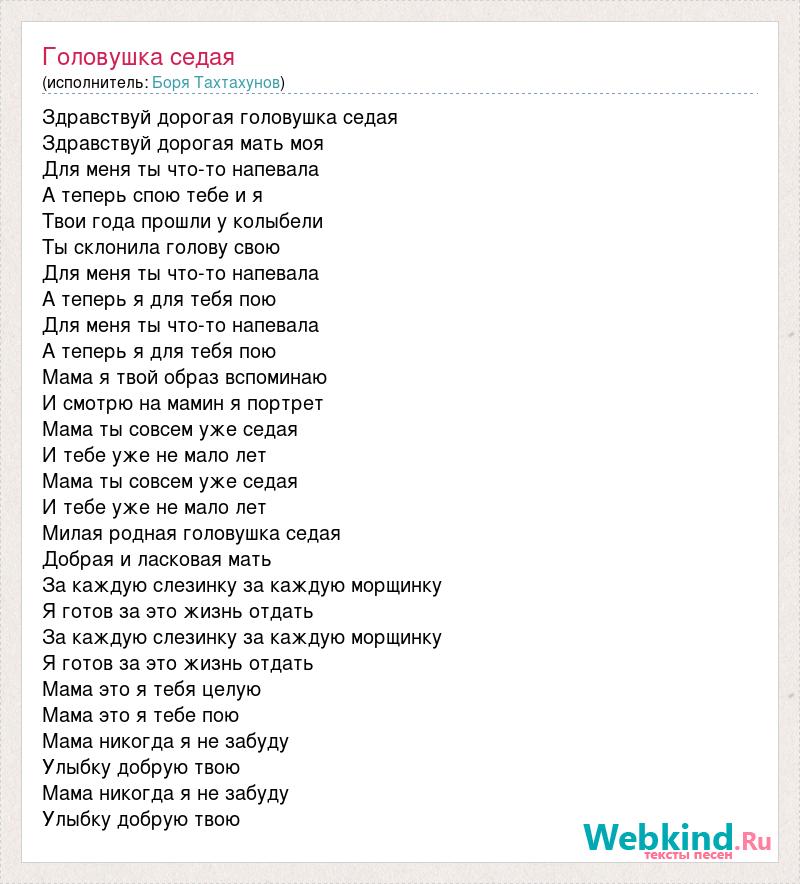 Здравствуй дорогая головушка седая Здравствуй дорогая мать моя Для меня ты что-то напевала А теперь спою тебе и я Твои года прошли у колыбели Ты склонила голову свою Для меня ты что-то напевала А теперь я для тебя пою Для меня ты что-то напевала А теперь я для тебя пою Мама я твой образ вспоминаю И смотрю на мамин я портрет Мама ты совсем уже седая И тебе уже не мало лет Мама ты совсем уже седая И тебе уже не мало лет Милая родная головушка седая Добрая и ласковая мать За каждую слезинку за каждую морщинку Я готов за это жизнь отдать За каждую слезинку за каждую морщинку Я готов за это жизнь отдать Мама это я тебя целую Мама это я тебе пою Мама никогда я не забуду Улыбку добрую твою Мама никогда я не забуду Улыбку добрую твою