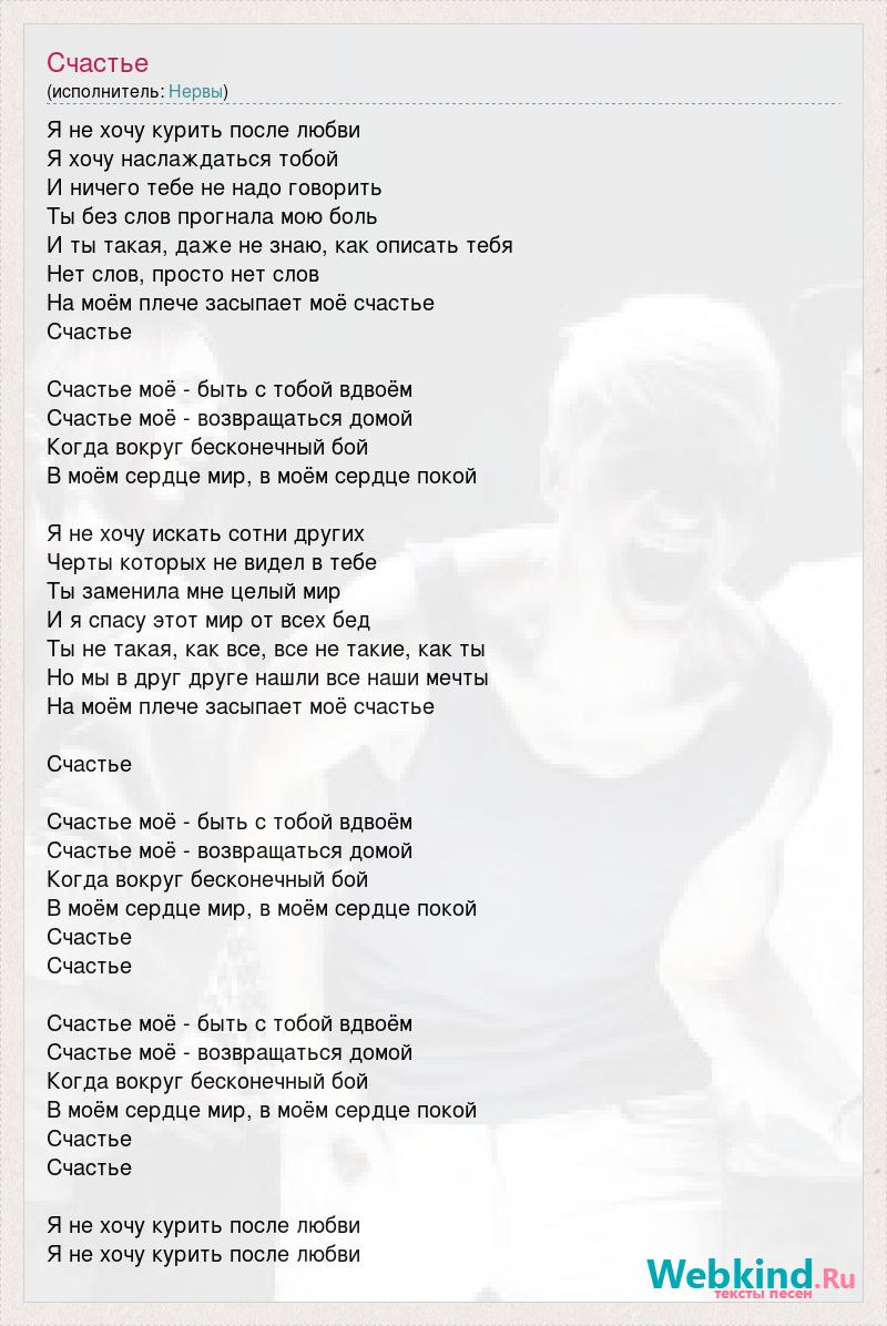 Я не хочу курить после любви Я хочу наслаждаться тобой И ничего тебе не надо говорить Ты без слов прогнала мою боль И ты такая, даже не знаю, как описать тебя Нет слов, просто нет слов На моём плече засыпает моё счастье Счастье Счастье моё - быть с тобой вдвоём Счастье моё - возвращаться домой Когда вокруг бесконечный бой В моём сердце мир, в моём сердце покой Я не хочу искать сотни других Черты которых не видел в тебе Ты заменила мне целый мир И я спасу этот мир от всех бед Ты не такая, как все, все не такие, как ты Но мы в друг друге нашли все наши мечты На моём плече засыпает моё счастье Счастье Счастье моё - быть с тобой вдвоём Счастье моё - возвращаться домой Когда вокруг бесконечный бой В моём сердце мир, в моём сердце покой Счастье Счастье Счастье моё - быть с тобой вдвоём Счастье моё - возвращаться домой Когда вокруг бесконечный бой В моём сердце мир, в моём сердце покой Счастье Счастье Я не хочу курить после любви Я не хочу курить после любви