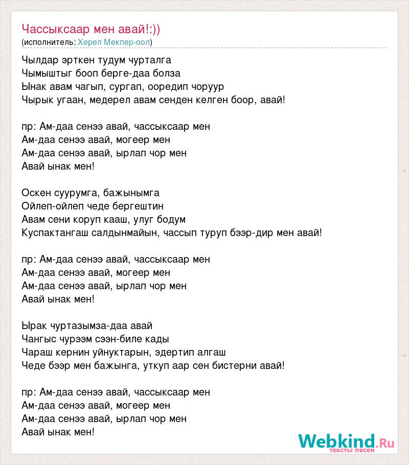 Чылдар эрткен тудум чурталга Чымыштыг бооп берге-даа болза Ынак авам чагып, сургап, ооредип чоруур Чырык угаан, медерел авам сенден келген боор, авай! пр: Ам-даа сенээ авай, чассыксаар мен Ам-даа сенээ авай, могеер мен Ам-даа сенээ авай, ырлап чор мен Авай ынак мен! Оскен суурумга, бажынымга Ойлеп-ойлеп чеде бергештин Авам сени коруп кааш, улуг бодум Куспактангаш салдынмайын, чассып туруп бээр-дир мен авай! пр: Ам-даа сенээ авай, чассыксаар мен Ам-даа сенээ авай, могеер мен Ам-даа сенээ авай, ырлап чор мен Авай ынак мен! Ырак чуртазымза-даа авай Чангыс чурээм сээн-биле кады Чараш кернин уйнуктарын, эдертип алгаш Чеде бээр мен бажынга, уткуп аар сен бистерни авай! пр: Ам-даа сенээ авай, чассыксаар мен Ам-даа сенээ авай, могеер мен Ам-даа сенээ авай, ырлап чор мен Авай ынак мен!