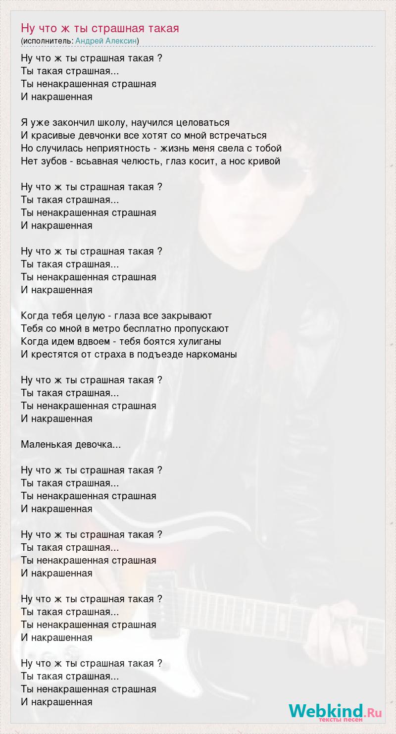 Ну что ж ты страшная такая ? Ты такая страшная... Ты ненакрашенная страшная И накрашенная Я уже закончил школу, научился целоваться И красивые девчонки все хотят со мной встречаться Но случилась неприятность - жизнь меня свела с тобой Нет зубов - всьавная челюсть, глаз косит, а нос кривой Ну что ж ты страшная такая ? Ты такая страшная... Ты ненакрашенная страшная И накрашенная Ну что ж ты страшная такая ? Ты такая страшная... Ты ненакрашенная страшная И накрашенная Когда тебя целую - глаза все закрывают Тебя со мной в метро бесплатно пропускают Когда идем вдвоем - тебя боятся хулиганы И крестятся от страха в подъезде наркоманы Ну что ж ты страшная такая ? Ты такая страшная... Ты ненакрашенная страшная И накрашенная Маленькая девочка... Ну что ж ты страшная такая ? Ты такая страшная... Ты ненакрашенная страшная И накрашенная Ну что ж ты страшная такая ? Ты такая страшная... Ты ненакрашенная страшная И накрашенная Ну что ж ты страшная такая ? Ты такая страшная... Ты ненакрашенная страшная И накрашенная Ну что ж ты страшная такая ? Ты такая страшная... Ты ненакрашенная страшная И накрашенная