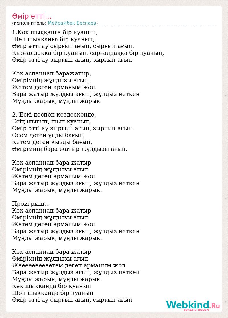1.Көк шыққанға бiр куанып, Шөп шыкканға бiр куанып, Өмір өтті ау сырғып ағып, сырғып ағып. Кызғалдакка бiр куанып, сарғалдаққа бір қуанып, Өмір өтті ау зырғып ағып, зырғып ағып. Көк аспаннан баражатыр, Өмірiмнiң жұлдызы ағып, Жетем деген арманым жол. Бара жатыр жұлдыз ағып, жұлдыз неткен Мұңлы жарық, мұңлы жарық. 2. Ескі доспен кездескенде, Есің шығып, шын қуанып, Өмір өтті ау зырғып ағып, зырғып ағып. Өсем деген ұлды бағып, Кетем деген кызды бағып, Өмірiмнiң бара жатыр жұлдызы ағып. Көк аспаннан бара жатыр Өмірiмнiң жұлдызы ағып Жетем деген арманым жол Бара жатыр жұлдыз ағып, жұлдыз неткен Мұңлы жарык, мұңлы жарык. Проигрыш… Көк аспаннан бара жатыр Өмірiмнiң жұлдызы ағып Жетем деген арманым жол Бара жатыр жұлдыз ағып, жұлдыз неткен Мұңлы жарык, мұңлы жарык. Көк аспаннан бара жатыр Өмірiмнiң жұлдызы ағып Жеееееееееетем деген арманым жол Бара жатыр жұлдыз ағып, жұлдыз неткен Мұңлы жарык, мұңлы жарык. Көк шыкканда бiр куанып Шөп шыкканда бiр куанып Өмір өтті ау сырғып ағып, сырғып ағып