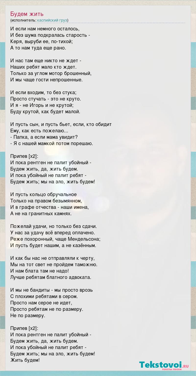 И если нам немного осталось, И без шума подкралась старость - Керя, выруби ее, по-тихой; А то нам туда еще рано. И нас там еще никто не ждет - Наших ребят мало кто ждет. Только за углом мотор брошенный, И мы чаще гости непрошенные. И если входим, то без стука; Просто стучать - это не круто. И я - не Игорь и не крутой; Буду крутой, как будет малой. И пусть сын, и пусть бьет, если, кто обидит Ему, как есть пожелаю... - Папка, а если мама увидит? - Я с нашей мамкой потом порешаю. Припев [x2]: И пока рентген не палит убойный - Будем жить, да, жить будем. И пока убойный не палит ребят - Будем жить; мы на зло, жить будем! И пусть кольцо обручальное Только на правом безымянном, И в графе отчества - наши имена, А не на гранитных камнях. Пожелай удачи, но только без сдачи. У нас за удачу всё вперед оплачено. Реже похоронный, чаще Мендельсона; И пусть будет нашим, а не казённым. И как бы нас не отправляли к черту, Мы на тот свет не пройдем таможню. И нам блата там не надо! Лучше ребятам блатного адвоката. И мы не бандиты - мы просто врозь С плохими ребятами в сером. Просто нам серое не идет, Просто ребятам не по размеру. Не по размеру. Припев [x2]: И пока рентген не палит убойный - Будем жить, да, жить будем. И пока убойный не палит ребят - Будем жить; мы на зло, жить будем! Жить будем!