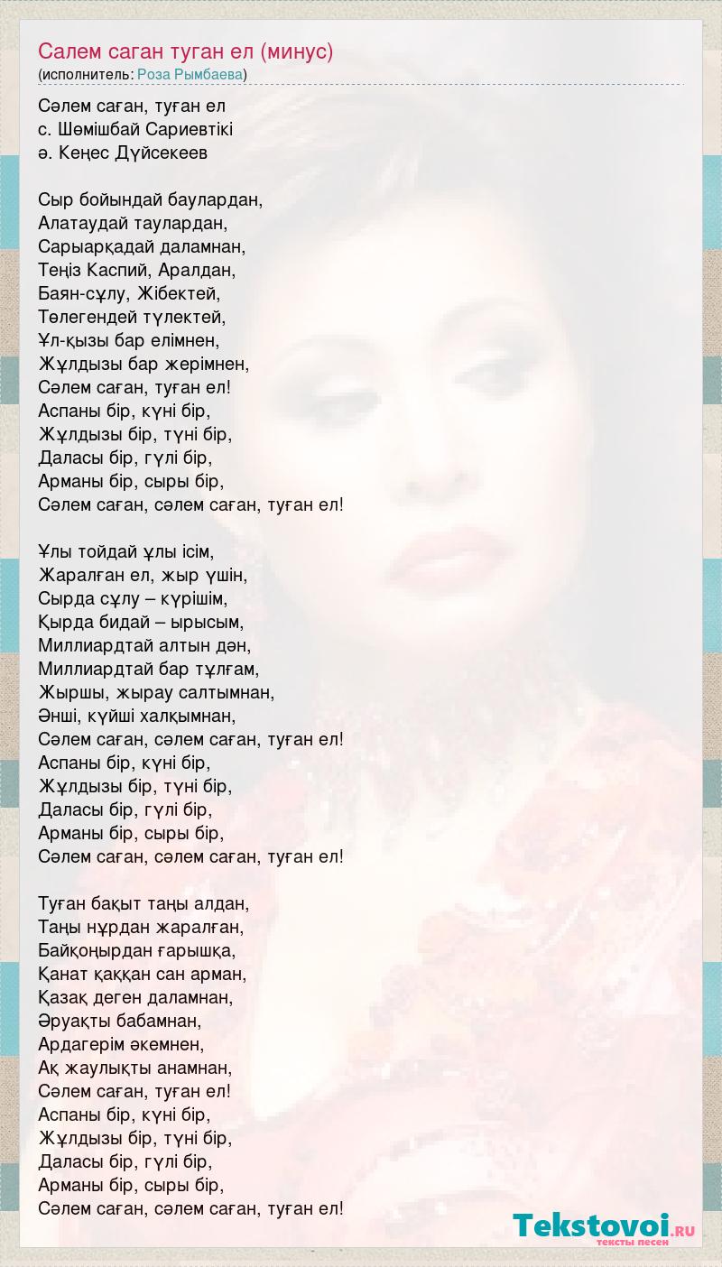 Сәлем саған, туған ел с. Шөмішбай Сариевтікі ә. Кеңес Дүйсекеев Сыр бойындай баулардан, Алатаудай таулардан, Сарыарқадай даламнан, Теңіз Каспий, Аралдан, Баян-сұлу, Жібектей, Төлегендей түлектей, Ұл-қызы бар елімнен, Жұлдызы бар жерімнен, Сәлем саған, туған ел! Аспаны бір, күні бір, Жұлдызы бір, түні бір, Даласы бір, гүлі бір, Арманы бір, сыры бір, Сәлем саған, сәлем саған, туған ел! Ұлы тойдай ұлы ісім, Жаралған ел, жыр үшін, Сырда сұлу – күрішім, Қырда бидай – ырысым, Миллиардтай алтын дән, Миллиардтай бар тұлғам, Жыршы, жырау салтымнан, Әнші, күйші халқымнан, Сәлем саған, сәлем саған, туған ел! Аспаны бір, күні бір, Жұлдызы бір, түні бір, Даласы бір, гүлі бір, Арманы бір, сыры бір, Сәлем саған, сәлем саған, туған ел! Туған бақыт таңы алдан, Таңы нұрдан жаралған, Байқоңырдан ғарышқа, Қанат қаққан сан арман, Қазақ деген даламнан, Әруақты бабамнан, Ардагерім әкемнен, Ақ жаулықты анамнан, Сәлем саған, туған ел! Аспаны бір, күні бір, Жұлдызы бір, түні бір, Даласы бір, гүлі бір, Арманы бір, сыры бір, Сәлем саған, сәлем саған, туған ел!