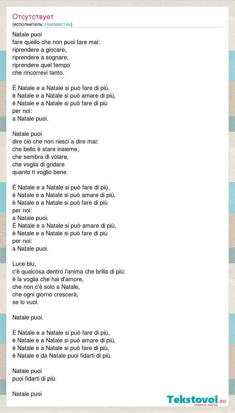 Natale puoi fare quello che non puoi fare mai: riprendere a giocare, riprendere a sognare, riprendere quel tempo che rincorrevi tanto. È Natale e a Natale si può fare di più, è Natale e a Natale si può amare di più, è Natale e a Natale si può fare di più per noi: a Natale puoi. Natale puoi dire ciò che non riesci a dire mai: che bello è stare insieme, che sembra di volare, che voglia di gridare quanto ti voglio bene. È Natale e a Natale si può fare di più, è Natale e a Natale si può amare di più, è Natale e a Natale si può fare di più per noi: a Natale puoi. È Natale e a Natale si può amare di più, è Natale e a Natale si può fare di più per noi: a Natale puoi. Luce blu, c'è qualcosa dentro l'anima che brilla di più: è la voglia che hai d'amore, che non c'è solo a Natale, che ogni giorno crescerà, se lo vuoi. Natale puoi. È Natale e a Natale si può fare di più, è Natale e a Natale si può amare di più, è Natale e a Natale si può fare di più, è Natale e da Natale puoi fidarti di più. Natale puoi puoi fidarti di più. Natale puoi