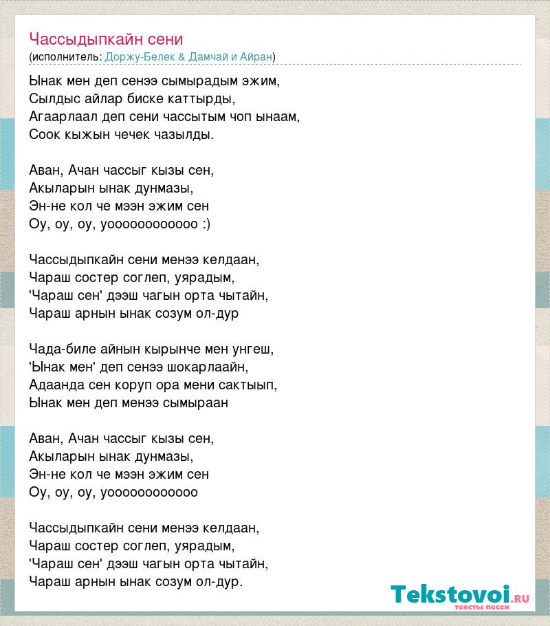 Ынак мен деп сенээ сымырадым эжим, Сылдыс айлар биске каттырды, Агаарлаал деп сени чассытым чоп ынаам, Соок кыжын чечек чазылды. Аван, Ачан чассыг кызы сен, Акыларын ынак дунмазы, Эн-не кол че мээн эжим сен Оу, оу, оу, уоооооооооооо :) Чассыдыпкайн сени менээ келдаан, Чараш состер соглеп, уярадым, 'Чараш сен' дээш чагын орта чытайн, Чараш арнын ынак созум ол-дур Чада-биле айнын кырынче мен унгеш, 'Ынак мен' деп сенээ шокарлаайн, Адаанда сен коруп ора мени сактыып, Ынак мен деп менээ сымыраан Аван, Ачан чассыг кызы сен, Акыларын ынак дунмазы, Эн-не кол че мээн эжим сен Оу, оу, оу, уоооооооооооо Чассыдыпкайн сени менээ келдаан, Чараш состер соглеп, уярадым, 'Чараш сен' дээш чагын орта чытайн, Чараш арнын ынак созум ол-дур.