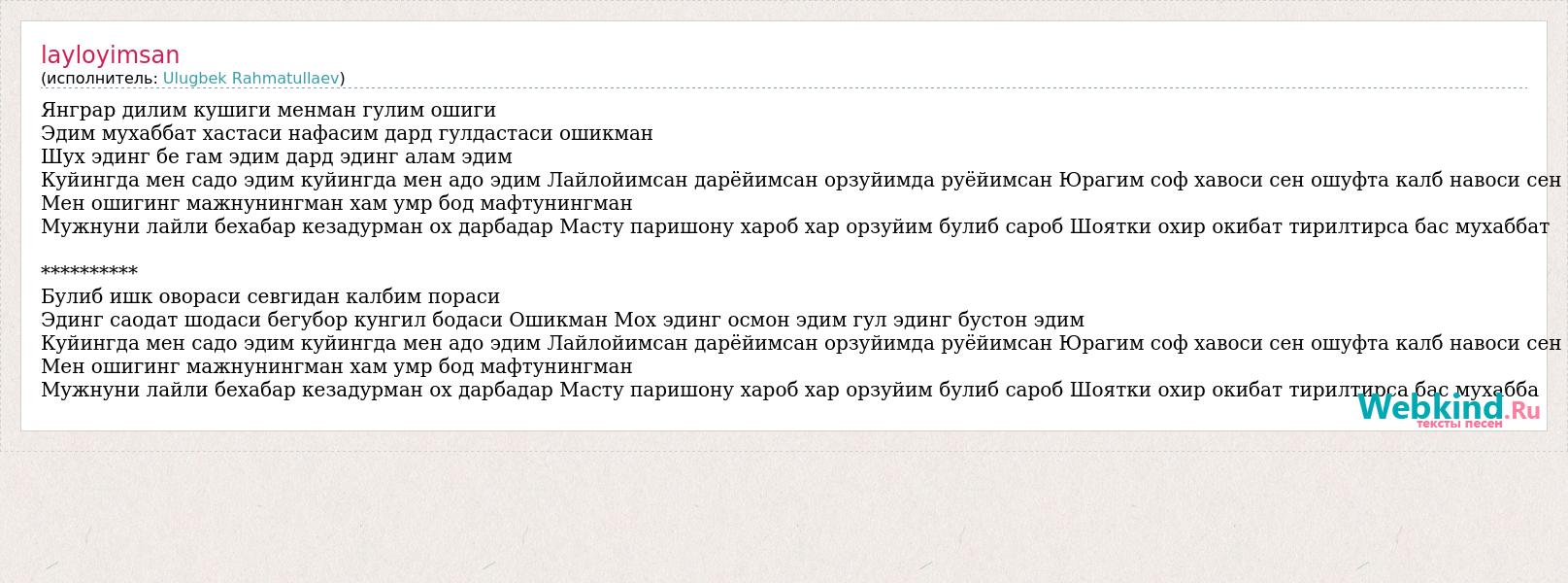 Янграр дилим кушиги менман гулим ошиги Эдим мухаббат хастаси нафасим дард гулдастаси ошикман Шух эдинг бе гам эдим дард эдинг алам эдим Куйингда мен садо эдим куйингда мен адо эдим Лайлойимсан дарёйимсан орзуйимда руёйимсан Юрагим соф хавоси сен ошуфта калб навоси сен Мен ошигинг мажнунингман хам умр бод мафтунингман Мужнуни лайли бехабар кезадурман ох дарбадар Масту паришону хароб хар орзуйим булиб сароб Шоятки охир окибат тирилтирса бас мухаббат ********** Булиб ишк овораси севгидан калбим пораси Эдинг саодат шодаси бегубор кунгил бодаси Ошикман Мох эдинг осмон эдим гул эдинг бустон эдим Куйингда мен садо эдим куйингда мен адо эдим Лайлойимсан дарёйимсан орзуйимда руёйимсан Юрагим соф хавоси сен ошуфта калб навоси сен Мен ошигинг мажнунингман хам умр бод мафтунингман Мужнуни лайли бехабар кезадурман ох дарбадар Масту паришону хароб хар орзуйим булиб сароб Шоятки охир окибат тирилтирса бас мухабба