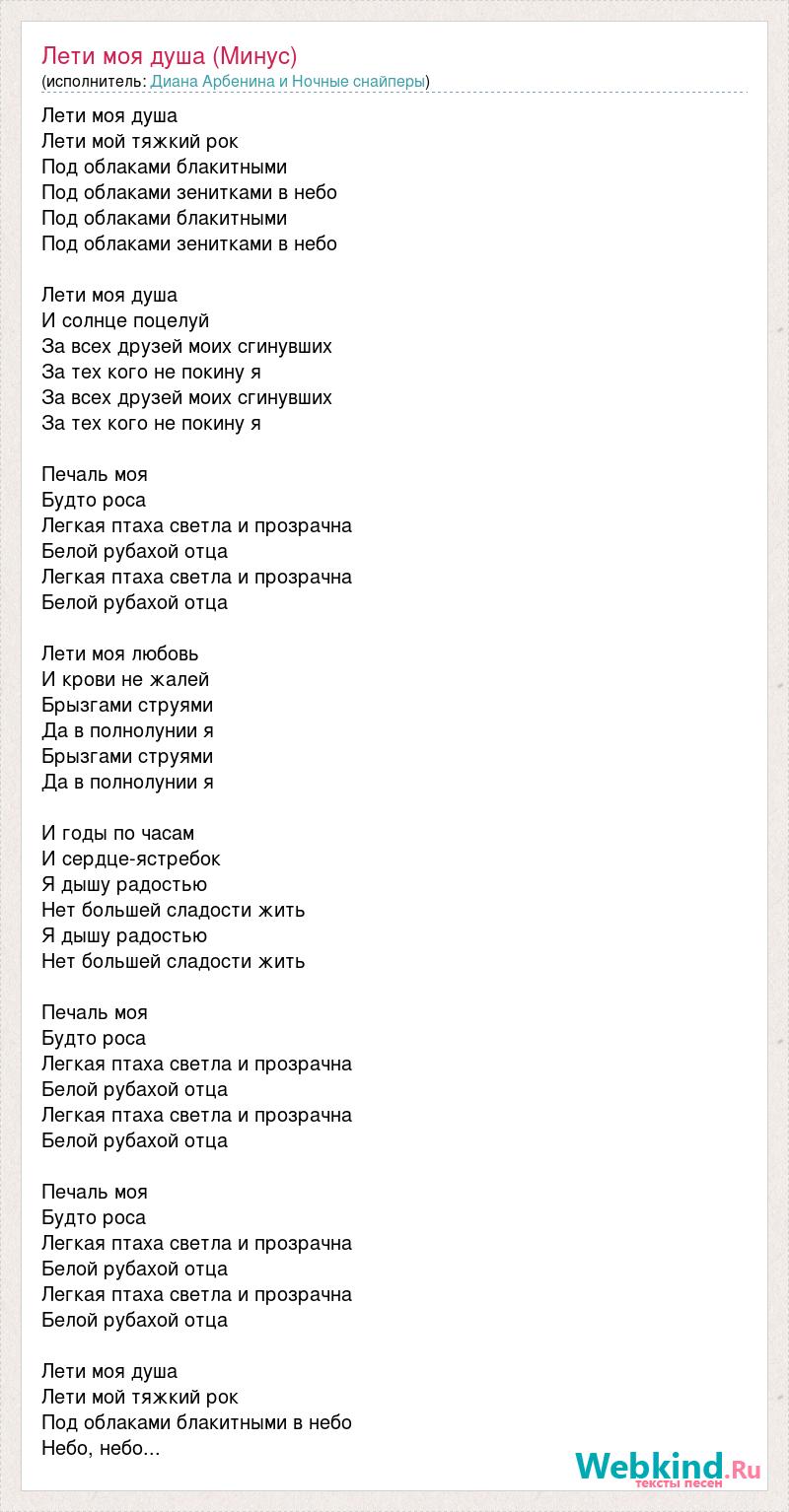 Лети моя душа Лети мой тяжкий рок Под облаками блакитными Под облаками зенитками в небо Под облаками блакитными Под облаками зенитками в небо Лети моя душа И солнце поцелуй За всех друзей моих сгинувших За тех кого не покину я За всех друзей моих сгинувших За тех кого не покину я Печаль моя Будто роса Легкая птаха светла и прозрачна Белой рубахой отца Легкая птаха светла и прозрачна Белой рубахой отца Лети моя любовь И крови не жалей Брызгами струями Да в полнолунии я Брызгами струями Да в полнолунии я И годы по часам И сердце-ястребок Я дышу радостью Нет большей сладости жить Я дышу радостью Нет большей сладости жить Печаль моя Будто роса Легкая птаха светла и прозрачна Белой рубахой отца Легкая птаха светла и прозрачна Белой рубахой отца Печаль моя Будто роса Легкая птаха светла и прозрачна Белой рубахой отца Легкая птаха светла и прозрачна Белой рубахой отца Лети моя душа Лети мой тяжкий рок Под облаками блакитными в небо Небо, небо...