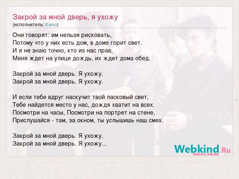 Они говорят: им нельзя рисковать, Потому что у них есть дом, в доме горит свет. И я не знаю точно, кто из нас прав, Меня ждет на улице дождь, их ждет дома обед. Закрой за мной дверь. Я ухожу. Закрой за мной дверь. Я ухожу. И если тебе вдруг наскучит твой ласковый свет, Тебе найдется место у нас, дождя хватит на всех. Посмотри на часы, Посмотри на портрет на стене, Прислушайся - там, за окном, ты услышишь наш смех. Закрой за мной дверь. Я ухожу. Закрой за мной дверь. Я ухожу...