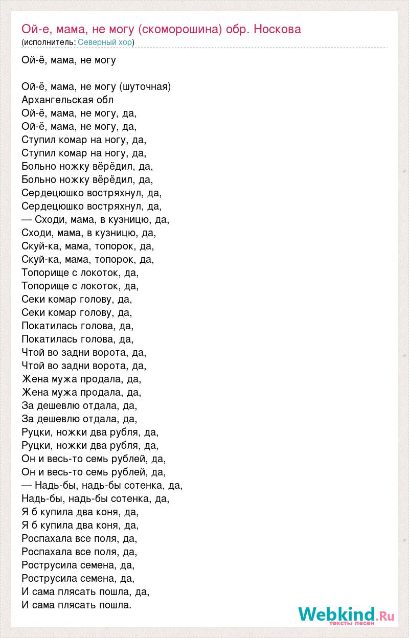 Ой-ё, мама, не могу Ой-ё, мама, не могу (шуточная) Архангельская обл Ой-ё, мама, не могу, да, Ой-ё, мама, не могу, да, Ступил комар на ногу, да, Ступил комар на ногу, да, Больно ножку вёрёдил, да, Больно ножку вёрёдил, да, Сердецюшко востряхнул, да, Сердецюшко востряхнул, да, — Сходи, мама, в кузницю, да, Сходи, мама, в кузницю, да, Скуй-ка, мама, топорок, да, Скуй-ка, мама, топорок, да, Топорище с локоток, да, Топорище с локоток, да, Секи комар голову, да, Секи комар голову, да, Покатилась голова, да, Покатилась голова, да, Чтой во задни ворота, да, Чтой во задни ворота, да, Жена мужа продала, да, Жена мужа продала, да, За дешевлю отдала, да, За дешевлю отдала, да, Руцки, ножки два рубля, да, Руцки, ножки два рубля, да, Он и весь-то семь рублей, да, Он и весь-то семь рублей, да, — Надь-бы, надь-бы сотенка, да, Надь-бы, надь-бы сотенка, да, Я б купила два коня, да, Я б купила два коня, да, Роспахала все поля, да, Роспахала все поля, да, Рострусила семена, да, Рострусила семена, да, И сама плясать пошла, да, И сама плясать пошла.