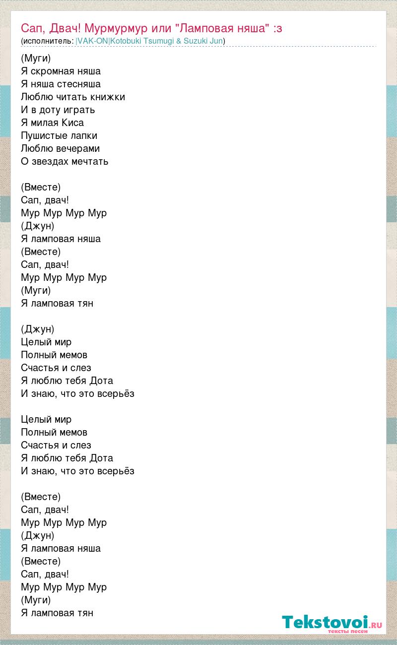 (Муги) Я скромная няша Я няша стесняша Люблю читать книжки И в доту играть Я милая Киса Пушистые лапки Люблю вечерами О звездах мечтать (Вместе) Сап, двач! Мур Мур Мур Мур (Джун) Я ламповая няша (Вместе) Сап, двач! Мур Мур Мур Мур (Муги) Я ламповая тян (Джун) Целый мир Полный мемов Счастья и слез Я люблю тебя Дота И знаю, что это всерьёз Целый мир Полный мемов Счастья и слез Я люблю тебя Дота И знаю, что это всерьёз (Вместе) Сап, двач! Мур Мур Мур Мур (Джун) Я ламповая няша (Вместе) Сап, двач! Мур Мур Мур Мур (Муги) Я ламповая тян