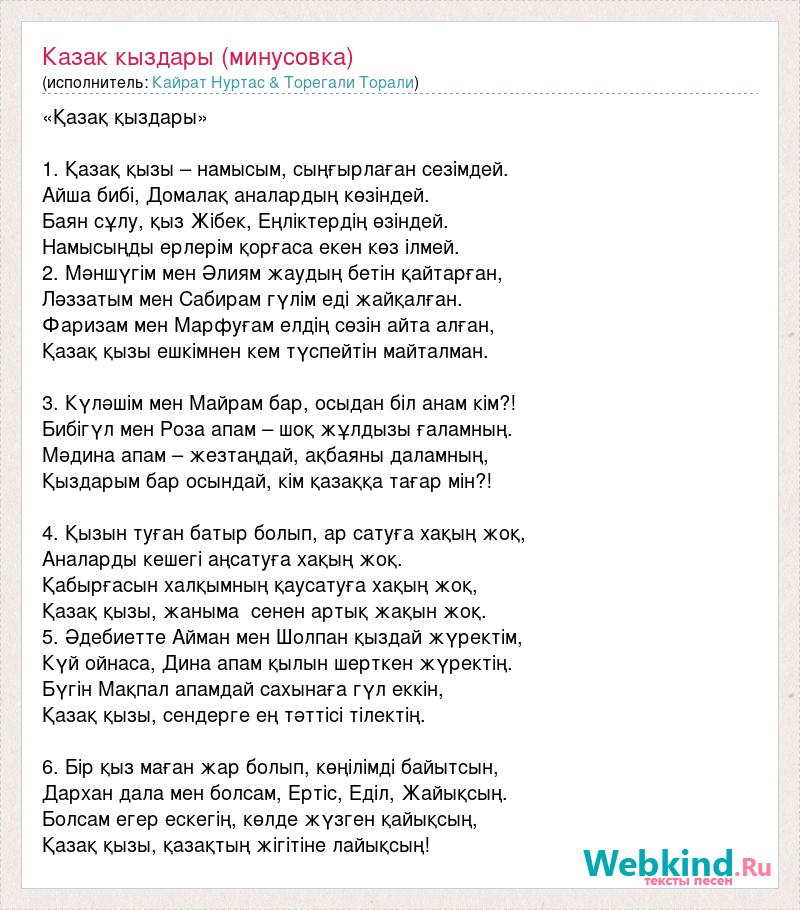 «Қазақ қыздары» 1. Қазақ қызы – намысым, сыңғырлаған сезімдей. Айша бибі, Домалақ аналардың көзіндей. Баян сұлу, қыз Жібек, Еңліктердің өзіндей. Намысыңды ерлерім қорғаса екен көз ілмей. 2. Мәншүгім мен Әлиям жаудың бетін қайтарған, Ләззатым мен Сабирам гүлім еді жайқалған. Фаризам мен Марфуғам елдің сөзін айта алған, Қазақ қызы ешкімнен кем түспейтін майталман. 3. Күләшім мен Майрам бар, осыдан біл анам кім?! Бибігүл мен Роза апам – шоқ жұлдызы ғаламның. Мәдина апам – жезтаңдай, ақбаяны даламның, Қыздарым бар осындай, кім қазаққа тағар мін?! 4. Қызын туған батыр болып, ар сатуға хақың жоқ, Аналарды кешегі аңсатуға хақың жоқ. Қабырғасын халқымның қаусатуға хақың жоқ, Қазақ қызы, жаныма сенен артық жақын жоқ. 5. Әдебиетте Айман мен Шолпан қыздай жүректім, Күй ойнаса, Дина апам қылын шерткен жүректің. Бүгін Мақпал апамдай сахынаға гүл еккін, Қазақ қызы, сендерге ең тәттісі тілектің. 6. Бір қыз маған жар болып, көңілімді байытсын, Дархан дала мен болсам, Ертіс, Еділ, Жайықсың. Болсам егер ескегің, көлде жүзген қайықсың, Қазақ қызы, қазақтың жігітіне лайықсың!
