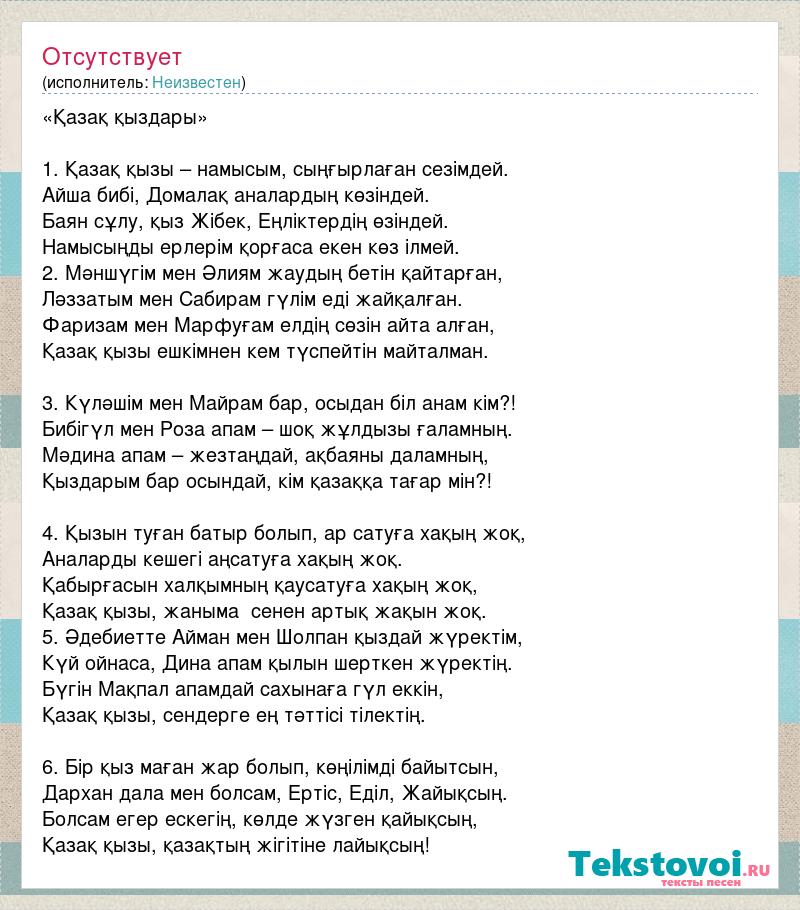 «Қазақ қыздары» 1. Қазақ қызы – намысым, сыңғырлаған сезімдей. Айша бибі, Домалақ аналардың көзіндей. Баян сұлу, қыз Жібек, Еңліктердің өзіндей. Намысыңды ерлерім қорғаса екен көз ілмей. 2. Мәншүгім мен Әлиям жаудың бетін қайтарған, Ләззатым мен Сабирам гүлім еді жайқалған. Фаризам мен Марфуғам елдің сөзін айта алған, Қазақ қызы ешкімнен кем түспейтін майталман. 3. Күләшім мен Майрам бар, осыдан біл анам кім?! Бибігүл мен Роза апам – шоқ жұлдызы ғаламның. Мәдина апам – жезтаңдай, ақбаяны даламның, Қыздарым бар осындай, кім қазаққа тағар мін?! 4. Қызын туған батыр болып, ар сатуға хақың жоқ, Аналарды кешегі аңсатуға хақың жоқ. Қабырғасын халқымның қаусатуға хақың жоқ, Қазақ қызы, жаныма сенен артық жақын жоқ. 5. Әдебиетте Айман мен Шолпан қыздай жүректім, Күй ойнаса, Дина апам қылын шерткен жүректің. Бүгін Мақпал апамдай сахынаға гүл еккін, Қазақ қызы, сендерге ең тәттісі тілектің. 6. Бір қыз маған жар болып, көңілімді байытсын, Дархан дала мен болсам, Ертіс, Еділ, Жайықсың. Болсам егер ескегің, көлде жүзген қайықсың, Қазақ қызы, қазақтың жігітіне лайықсың!