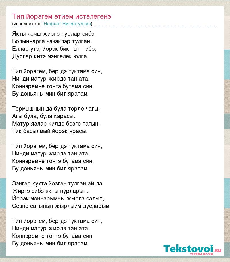 Якты кояш жиргэ нурлар сибэ, Болыннарга чэчэклэр тулган. Еллар утэ, йорэк бик тын тибэ, Дуслар китэ мэнгелек юлга. Тип йорэгем, бер дэ туктама син, Нинди матур жирдэ тан ата. Коннэремне тонгэ бутама син, Бу доньяны мин бит яратам. Тормышнын да була торле чагы, Агы була, була карасы. Матур язлар килде безгэ тагын, Тик басылмый йорэк ярасы. Тип йорэгем, бер дэ туктама син, Нинди матур жирдэ тан ата. Коннэремне тонгэ бутама син, Бу доньяны мин бит яратам. Зэнгэр куктэ йозгэн тулган ай да Жиргэ сибэ якты нурларын. Йорэк моннарымны жырга салып, Сезне сагынып жырлыйм дусларым. Тип йорэгем, бер дэ туктама син, Нинди матур жирдэ тан ата. Коннэремне тонгэ бутама син, Бу доньяны мин бит яратам.