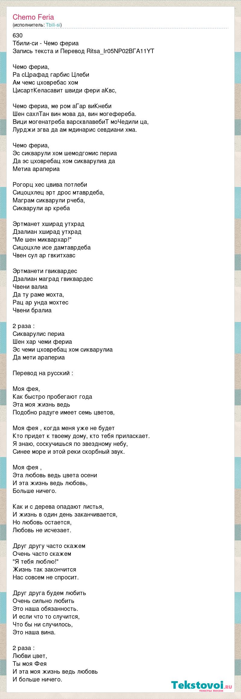 630 Тбили-си - Чемо фериа Запись текста и Перевод Ritsa_Ir05NP02ВГА11YT Чемо фериа, Ра сЦрафад гарбис Цлеби Ам чемс цховребас хом ЦисартКеласавит швиди фери аКвс, Чемо фериа, ме ром аГар виКнеби Шен сахлТан вин мова да, вин могефереба. Вици могенатреба варсквлавебиТ моЧедили ца, Лурджи згва да ам мдинарис севдиани хма. Чемо фериа, Эс сикварули хом шемодгомис периа Да эс цховребац хом сикварулиа да Метиа арапериа Рогорц хес цвива потлеби Сицоцхлец эрт дрос мтаврдеба, Маграм сикварули рчеба, Сикварули ар креба Эртманет хширад утхрад Дзалиан хширад утхрад "Ме шен миквархар!" Сицоцхле исе дамтаврдеба Чвен сул ар гвкитхавс Эртманети гвиквардес Дзалиан маград гвиквардес Чвени валиа Да ту раме мохта, Рац ар унда мохтес Чвени бралиа 2 раза : Сикварулис периа Шен хар чеми фериа Эс чеми цховребац хом сикварулиа Да мети арапериа Перевод на русский : Моя фея, Как быстро пробегают года Эта моя жизнь ведь Подобно радуге имеет семь цветов, Моя фея , когда меня уже не будет Кто придет к твоему дому, кто тебя приласкает. Я знаю, соскучишься по звездному небу, Синее море и этой реки скорбный звук. Моя фея , Эта любовь ведь цвета осени И эта жизнь ведь любовь, Больше ничего. Как и с дерева опадают листья, И жизнь в один день заканчивается, Но любовь остается, Любовь не исчезает. Друг другу часто скажем Очень часто скажем "Я тебя люблю!" Жизнь так закончится Нас совсем не спросит. Друг друга будем любить Очень сильно любить Это наша обязанность. И если что то случится, Что бы ни случилось, Это наша вина. 2 раза : Любви цвет, Ты моя Фея И эта моя жизнь ведь любовь И больше ничего.