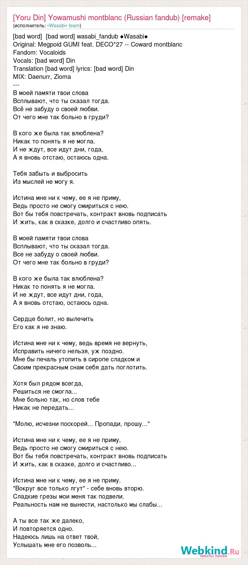 [bad word] [bad word] wasabi_fandub ●Wasabi● Original: Megpoid GUMI feat. DECO*27 -- Coward montblanc Fandom: Vocaloids Vocals: [bad word] Din Translation [bad word] lyrics: [bad word] Din MIX: Daenurr, Zioma --- В моей памяти твои слова Всплывают, что ты сказал тогда. Всё не забуду о своей любви. От чего мне так больно в груди? В кого же была так влюблена? Никак то понять я не могла. И не ждут, все идут дни, года, А я вновь отстаю, остаюсь одна. Тебя забыть и выбросить Из мыслей не могу я. Истина мне ни к чему, ее я не приму, Ведь просто не смогу смириться с нею. Вот бы тебя повстречать, контракт вновь подписать И жить, как в сказке, долго и счастливо опять. В моей памяти твои слова Всплывают, что ты сказал тогда. Все не забуду о своей любви. От чего мне так больно в груди? В кого же была так влюблена? Никак то понять я не могла. И не ждут, все идут дни, года, А я вновь отстаю, остаюсь одна. Сердце болит, но вылечить Его как я не знаю. Истина мне ни к чему, ведь время не вернуть, Исправить ничего нельзя, уж поздно. Мне бы печаль утопить в сиропе сладком и Своим прекрасным снам себя дать поглотить. Хотя был рядом всегда, Решиться не смогла... Мне больно так, но слов тебе Никак не передать... "Молю, исчезни поскорей... Пропади, прошу..." Истина мне ни к чему, ее я не приму, Ведь просто не смогу смириться с нею. Вот бы тебя повстречать, контракт вновь подписать И жить, как в сказке, долго и счастливо... Истина мне ни к чему, ее я не приму. "Вокруг все только лгут" - себе вновь вторю. Сладкие грезы мои меня так подвели. Реальность нам не вынести, настолько мы слабы... А ты все так же далеко, И повторяется одно. Надеюсь лишь на ответ твой, Услышать мне его позволь...