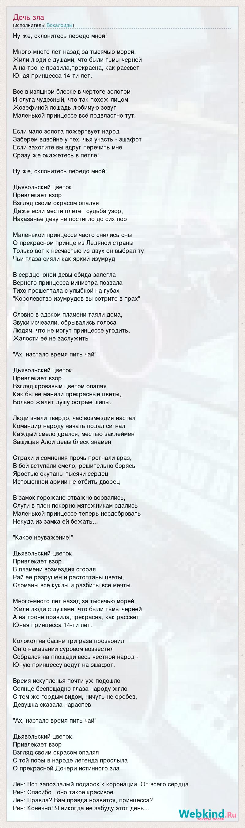 Ну же, склонитесь передо мной! Много-много лет назад за тысячью морей, Жили люди с душами, что были тьмы черней А на троне правила,прекрасна, как рассвет Юная принцесса 14-ти лет. Все в изящном блеске в чертоге золотом И слуга чудесный, что так похож лицом Жозефиной лошадь любимую зовут Маленькой принцессе всё подвластно тут. Если мало золота пожертвует народ Заберем вдвойне у тех, чья участь - эшафот Если захотите вы вдруг перечить мне Сразу же окажетесь в петле! Ну же, склонитесь передо мной! Дьявольский цветок Привлекает взор Взгляд своим окрасом опаляя Даже если мести плетет судьба узор, Наказанье деву не постигло до сих пор Маленькой принцессе часто снились сны О прекрасном принце из Ледяной страны Только вот к несчастью из двух он выбрал ту Чьи глаза сияли как яркий изумруд В сердце юной девы обида залегла Верного принцесса министра позвала Тихо прошептала с улыбкой на губах "Королевство изумрудов вы сотрите в прах" Словно в адском пламени таяли дома, Звуки исчезали, обрывались голоса Людям, что не могут принцессе угодить, Жалости её не заслужить "Ах, настало время пить чай" Дьявольский цветок Привлекает взор Взгляд кровавым цветом опаляя Как бы не манили прекрасные цветы, Больно жалят душу острые шипы. Люди знали твердо, час возмездия настал Командир народу начать подал сигнал Каждый смело дрался, местью заклеймен Защищая Алой девы блеск знамен Страхи и сомнения прочь прогнали враз, В бой вступали смело, решительно борясь Яростью окутаны тысячи сердец Истощенной армии не отбить дворец В замок горожане отважно ворвались, Слуги в плен покорно мятежникам сдались Маленькой принцессе теперь несдобровать Некуда из замка ей бежать... "Какое неуважение!" Дьявольский цветок Привлекает взор В пламени возмездия сгорая Рай её разрушен и растоптаны цветы, Сломаны все куклы и разбиты все мечты. Много-много лет назад за тысячью морей, Жили люди с душами, что были тьмы черней А на троне правила,прекрасна, как рассвет Юная принцесса 14-ти лет. Колокол на башне три раза прозвонил Он о наказании суровом возвестил Собрался на площади весь честной народ - Юную принцессу ведут на эшафот. Время искупленья почти уж подошло Солнце беспощадно глаза народу жгло С тем же гордым видом, ничуть не оробев, Девушка сказала нараспев "Ах, настало время пить чай" Дьявольский цветок Привлекает взор Взгляд своим окрасом опаляя С той поры в народе легенда прослыла О прекрасной Дочери истинного зла Лен: Вот запоздалый подарок к коронации. От всего сердца. Рин: Спасибо...оно такое красивое. Лен: Правда? Вам правда нравится, принцесса? Рин: Конечно! Я никогда не забуду этот день...