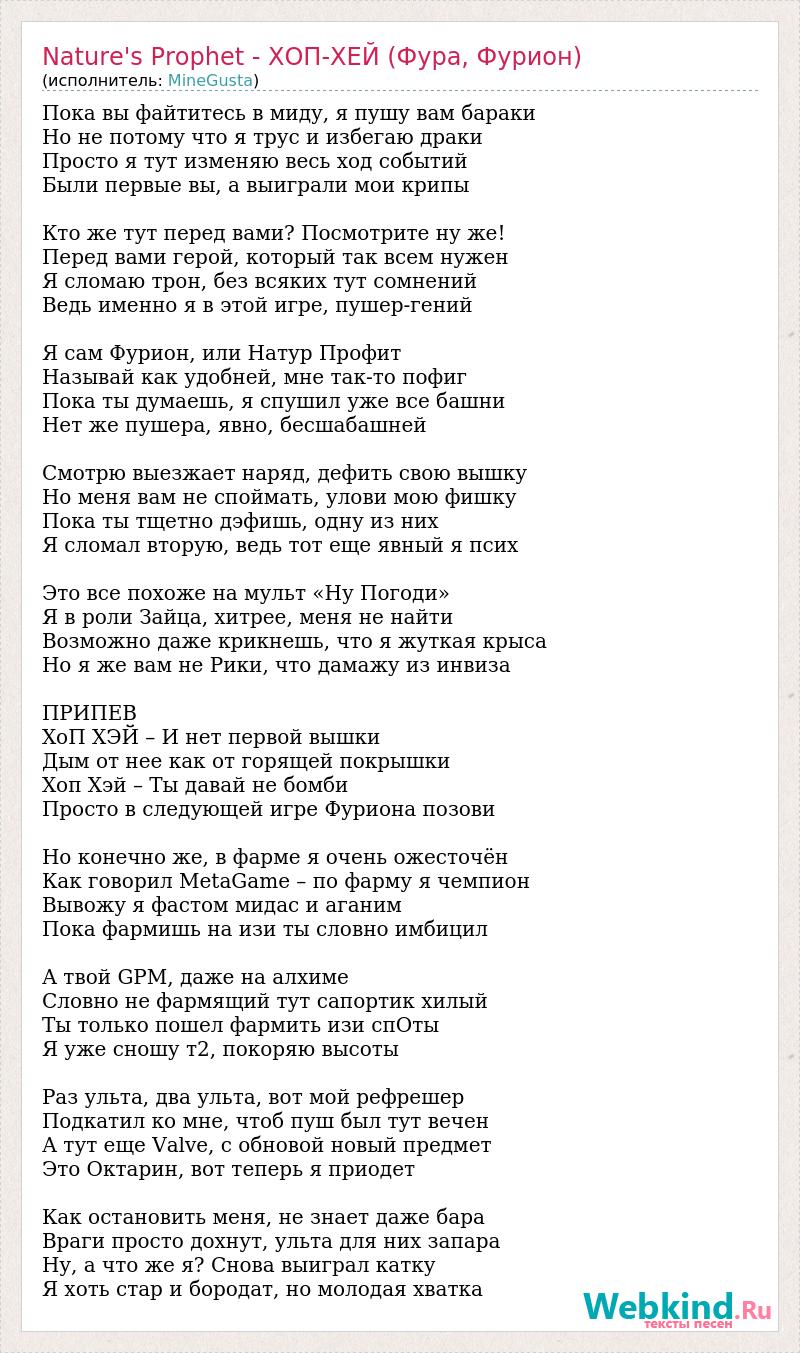 Пока вы файтитесь в миду, я пушу вам бараки Но не потому что я трус и избегаю драки Просто я тут изменяю весь ход событий Были первые вы, а выиграли мои крипы Кто же тут перед вами? Посмотрите ну же! Перед вами герой, который так всем нужен Я сломаю трон, без всяких тут сомнений Ведь именно я в этой игре, пушер-гений Я сам Фурион, или Натур Профит Называй как удобней, мне так-то пофиг Пока ты думаешь, я спушил уже все башни Нет же пушера, явно, бесшабашней Смотрю выезжает наряд, дефить свою вышку Но меня вам не споймать, улови мою фишку Пока ты тщетно дэфишь, одну из них Я сломал вторую, ведь тот еще явный я псих Это все похоже на мульт «Ну Погоди» Я в роли Зайца, хитрее, меня не найти Возможно даже крикнешь, что я жуткая крыса Но я же вам не Рики, что дамажу из инвиза ПРИПЕВ ХоП ХЭЙ – И нет первой вышки Дым от нее как от горящей покрышки Хоп Хэй – Ты давай не бомби Просто в следующей игре Фуриона позови Но конечно же, в фарме я очень ожесточён Как говорил MetaGame – по фарму я чемпион Вывожу я фастом мидас и аганим Пока фармишь на изи ты словно имбицил А твой GPM, даже на алхиме Словно не фармящий тут сапортик хилый Ты только пошел фармить изи спОты Я уже сношу т2, покоряю высоты Раз ульта, два ульта, вот мой рефрешер Подкатил ко мне, чтоб пуш был тут вечен А тут еще Valve, с обновой новый предмет Это Октарин, вот теперь я приодет Как остановить меня, не знает даже бара Враги просто дохнут, ульта для них запара Ну, а что же я? Снова выиграл катку Я хоть стар и бородат, но молодая хватка