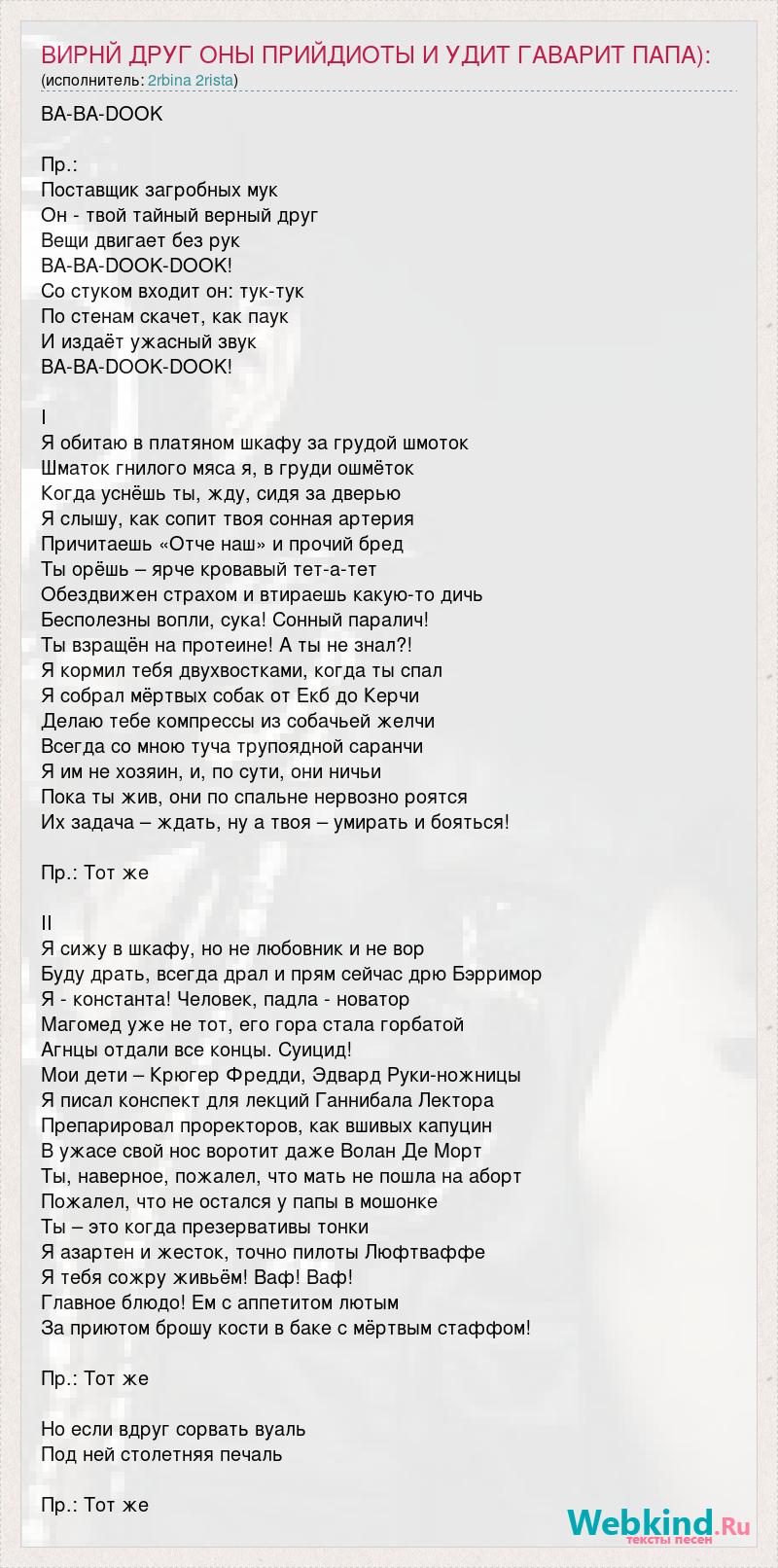 BA-BA-DOOK Пр.: Поставщик загробных мук Он - твой тайный верный друг Вещи двигает без рук BA-BA-DOOK-DOOK! Со стуком входит он: тук-тук По стенам скачет, как паук И издаёт ужасный звук BA-BA-DOOK-DOOK! I Я обитаю в платяном шкафу за грудой шмоток Шматок гнилого мяса я, в груди ошмёток Когда уснёшь ты, жду, сидя за дверью Я слышу, как сопит твоя сонная артерия Причитаешь «Отче наш» и прочий бред Ты орёшь – ярче кровавый тет-а-тет Обездвижен страхом и втираешь какую-то дичь Бесполезны вопли, сука! Сонный паралич! Ты взращён на протеине! А ты не знал?! Я кормил тебя двухвостками, когда ты спал Я собрал мёртвых собак от Екб до Керчи Делаю тебе компрессы из собачьей желчи Всегда со мною туча трупоядной саранчи Я им не хозяин, и, по сути, они ничьи Пока ты жив, они по спальне нервозно роятся Их задача – ждать, ну а твоя – умирать и бояться! Пр.: Тот же II Я сижу в шкафу, но не любовник и не вор Буду драть, всегда драл и прям сейчас дрю Бэрримор Я - константа! Человек, падла - новатор Магомед уже не тот, его гора стала горбатой Агнцы отдали все концы. Суицид! Мои дети – Крюгер Фредди, Эдвард Руки-ножницы Я писал конспект для лекций Ганнибала Лектора Препарировал проректоров, как вшивых капуцин В ужасе свой нос воротит даже Волан Де Морт Ты, наверное, пожалел, что мать не пошла на аборт Пожалел, что не остался у папы в мошонке Ты – это когда презервативы тонки Я азартен и жесток, точно пилоты Люфтваффе Я тебя сожру живьём! Ваф! Ваф! Главное блюдо! Ем с аппетитом лютым За приютом брошу кости в баке с мёртвым стаффом! Пр.: Тот же Но если вдруг сорвать вуаль Под ней столетняя печаль Пр.: Тот же