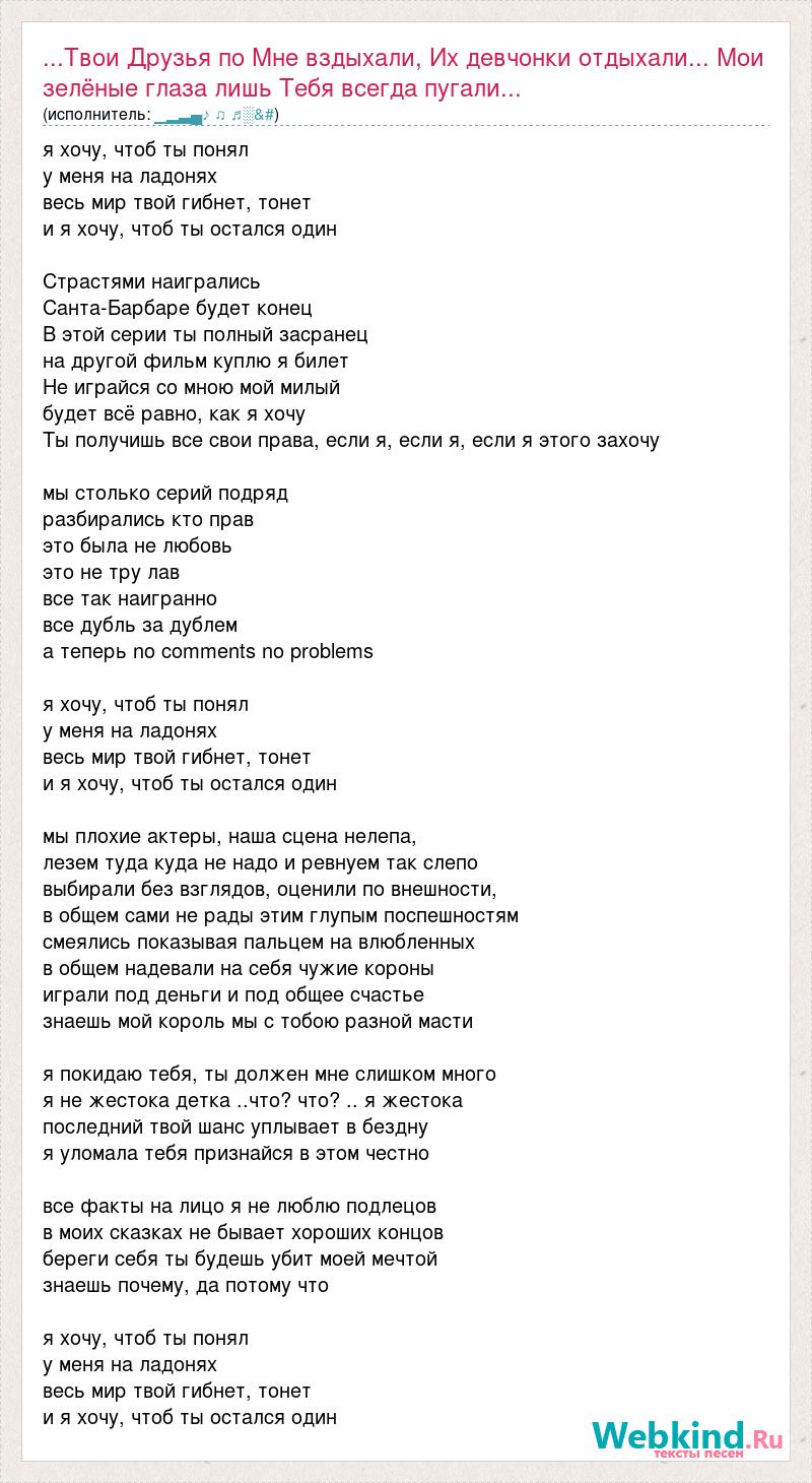 я хочу, чтоб ты понял у меня на ладонях весь мир твой гибнет, тонет и я хочу, чтоб ты остался один Страстями наигрались Санта-Барбаре будет конец В этой серии ты полный засранец на другой фильм куплю я билет Не играйся со мною мой милый будет всё равно, как я хочу Ты получишь все свои права, если я, если я, если я этого захочу мы столько серий подряд разбирались кто прав это была не любовь это не тру лав все так наигранно все дубль за дублем а теперь no comments no problems я хочу, чтоб ты понял у меня на ладонях весь мир твой гибнет, тонет и я хочу, чтоб ты остался один мы плохие актеры, наша сцена нелепа, лезем туда куда не надо и ревнуем так слепо выбирали без взглядов, оценили по внешности, в общем сами не рады этим глупым поспешностям смеялись показывая пальцем на влюбленных в общем надевали на себя чужие короны играли под деньги и под общее счастье знаешь мой король мы с тобою разной масти я покидаю тебя, ты должен мне слишком много я не жестока детка ..что? что? .. я жестока последний твой шанс уплывает в бездну я уломала тебя признайся в этом честно все факты на лицо я не люблю подлецов в моих сказках не бывает хороших концов береги себя ты будешь убит моей мечтой знаешь почему, да потому что я хочу, чтоб ты понял у меня на ладонях весь мир твой гибнет, тонет и я хочу, чтоб ты остался один