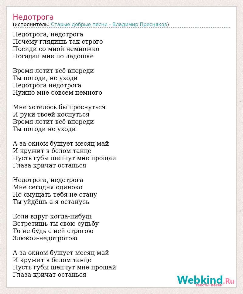 Недотрога, недотрога Почему глядишь так строго Посиди со мной немножко Погадай мне по ладошке Время летит всё впереди Ты погоди, не уходи Недотрога недотрога Нужно мне совсем немного Мне хотелось бы проснуться И руки твоей коснуться Время летит всё впереди Ты погоди не уходи А за окном бушует месяц май И кружит в белом танце Пусть губы шепчут мне прощай Глаза кричат останься Недотрога, недотрога Мне сегодня одиноко Но смущать тебя не стану Ты уйдёшь а я останусь Если вдруг когда-нибудь Встретишь ты свою судьбу То не будь с ней строгою Злюкой-недотрогою А за окном бушует месяц май И кружит в белом танце Пусть губы шепчут мне прощай Глаза кричат останься