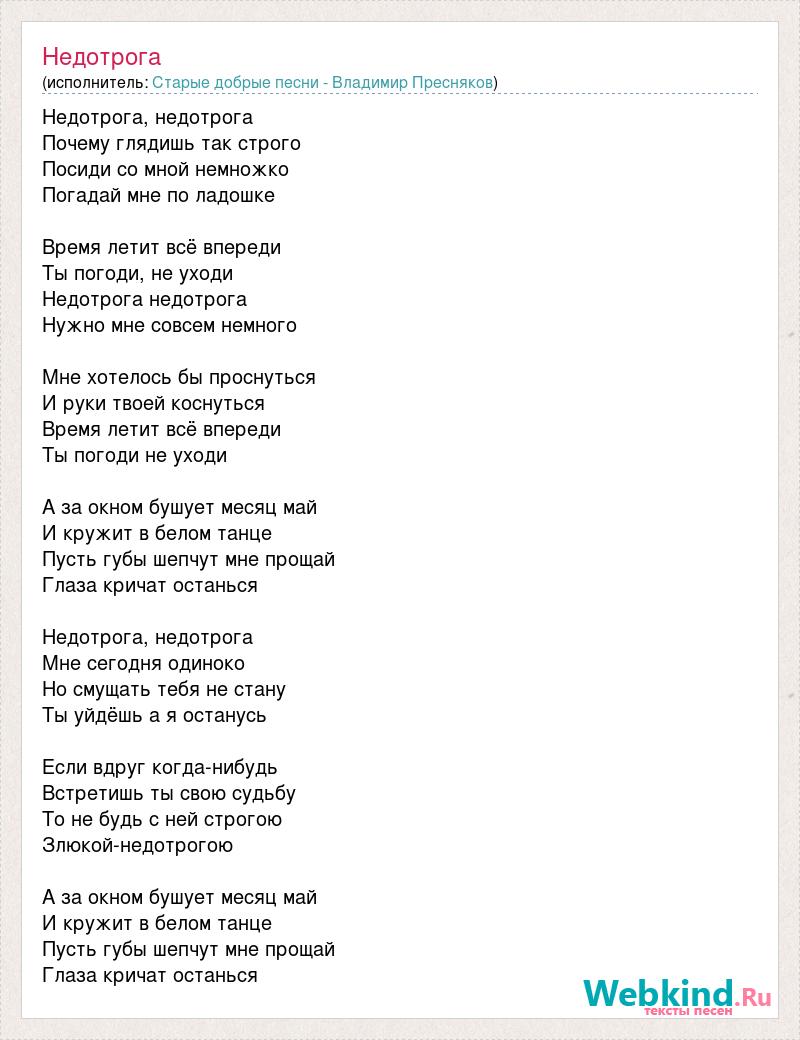 Недотрога, недотрога Почему глядишь так строго Посиди со мной немножко Погадай мне по ладошке Время летит всё впереди Ты погоди, не уходи Недотрога недотрога Нужно мне совсем немного Мне хотелось бы проснуться И руки твоей коснуться Время летит всё впереди Ты погоди не уходи А за окном бушует месяц май И кружит в белом танце Пусть губы шепчут мне прощай Глаза кричат останься Недотрога, недотрога Мне сегодня одиноко Но смущать тебя не стану Ты уйдёшь а я останусь Если вдруг когда-нибудь Встретишь ты свою судьбу То не будь с ней строгою Злюкой-недотрогою А за окном бушует месяц май И кружит в белом танце Пусть губы шепчут мне прощай Глаза кричат останься