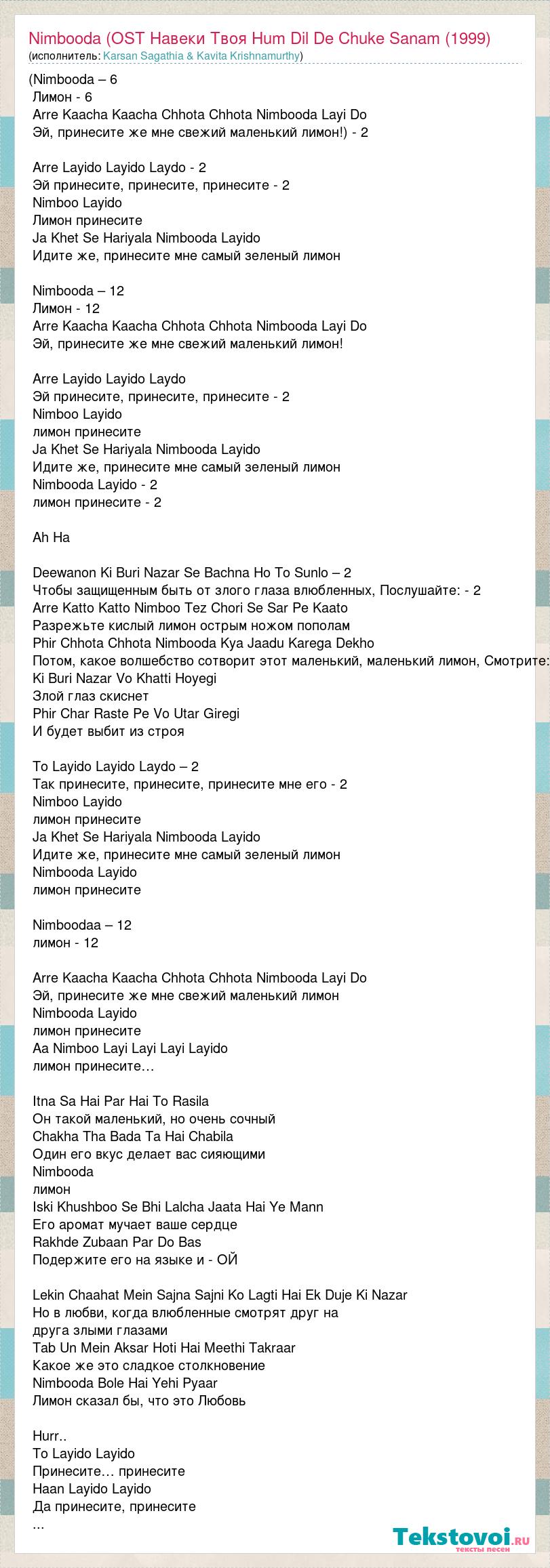 (Nimbooda – 6 Лимон - 6 Arre Kaacha Kaacha Chhota Chhota Nimbooda Layi Do Эй, принесите же мне свежий маленький лимон!) - 2 Arre Layido Layido Laydo - 2 Эй принесите, принесите, принесите - 2 Nimboo Layido Лимон принесите Ja Khet Se Hariyala Nimbooda Layido Идите же, принесите мне самый зеленый лимон Nimbooda – 12 Лимон - 12 Arre Kaacha Kaacha Chhota Chhota Nimbooda Layi Do Эй, принесите же мне свежий маленький лимон! Arre Layido Layido Laydo Эй принесите, принесите, принесите - 2 Nimboo Layido лимон принесите Ja Khet Se Hariyala Nimbooda Layido Идите же, принесите мне самый зеленый лимон Nimbooda Layido - 2 лимон принесите - 2 Ah Ha Deewanon Ki Buri Nazar Se Bachna Ho To Sunlo – 2 Чтобы защищенным быть от злого глаза влюбленных, Послушайте: - 2 Arre Katto Katto Nimboo Tez Chori Se Sar Pe Kaato Разрежьте кислый лимон острым ножом пополам Phir Chhota Chhota Nimbooda Kya Jaadu Karega Dekho Потом, какое волшебство сотворит этот маленький, маленький лимон, Смотрите: Ki Buri Nazar Vo Khatti Hoyegi Злой глаз скиснет Phir Char Raste Pe Vo Utar Giregi И будет выбит из строя To Layido Layido Laydo – 2 Так принесите, принесите, принесите мне его - 2 Nimboo Layido лимон принесите Ja Khet Se Hariyala Nimbooda Layido Идите же, принесите мне самый зеленый лимон Nimbooda Layido лимон принесите Nimboodaa – 12 лимон - 12 Arre Kaacha Kaacha Chhota Chhota Nimbooda Layi Do Эй, принесите же мне свежий маленький лимон Nimbooda Layido лимон принесите Aa Nimboo Layi Layi Layi Layido лимон принесите… Itna Sa Hai Par Hai To Rasila Он такой маленький, но очень сочный Chakha Tha Bada Ta Hai Chabila Один его вкус делает вас сияющими Nimbooda лимон Iski Khushboo Se Bhi Lalcha Jaata Hai Ye Mann Его аромат мучает ваше сердце Rakhde Zubaan Par Do Bas Подержите его на языке и - ОЙ Lekin Chaahat Mein Sajna Sajni Ko Lagti Hai Ek Duje Ki Nazar Но в любви, когда влюбленные смотрят друг на друга злыми глазами Tab Un Mein Aksar Hoti Hai Meethi Takraar Какое же это сладкое столкновение Nimbooda Bole Hai Yehi Pyaar Лимон сказал бы, что это Любовь Hurr.. To Layido Layido Принесите… принесите Haan Layido Layido Да принесите, принесите ...