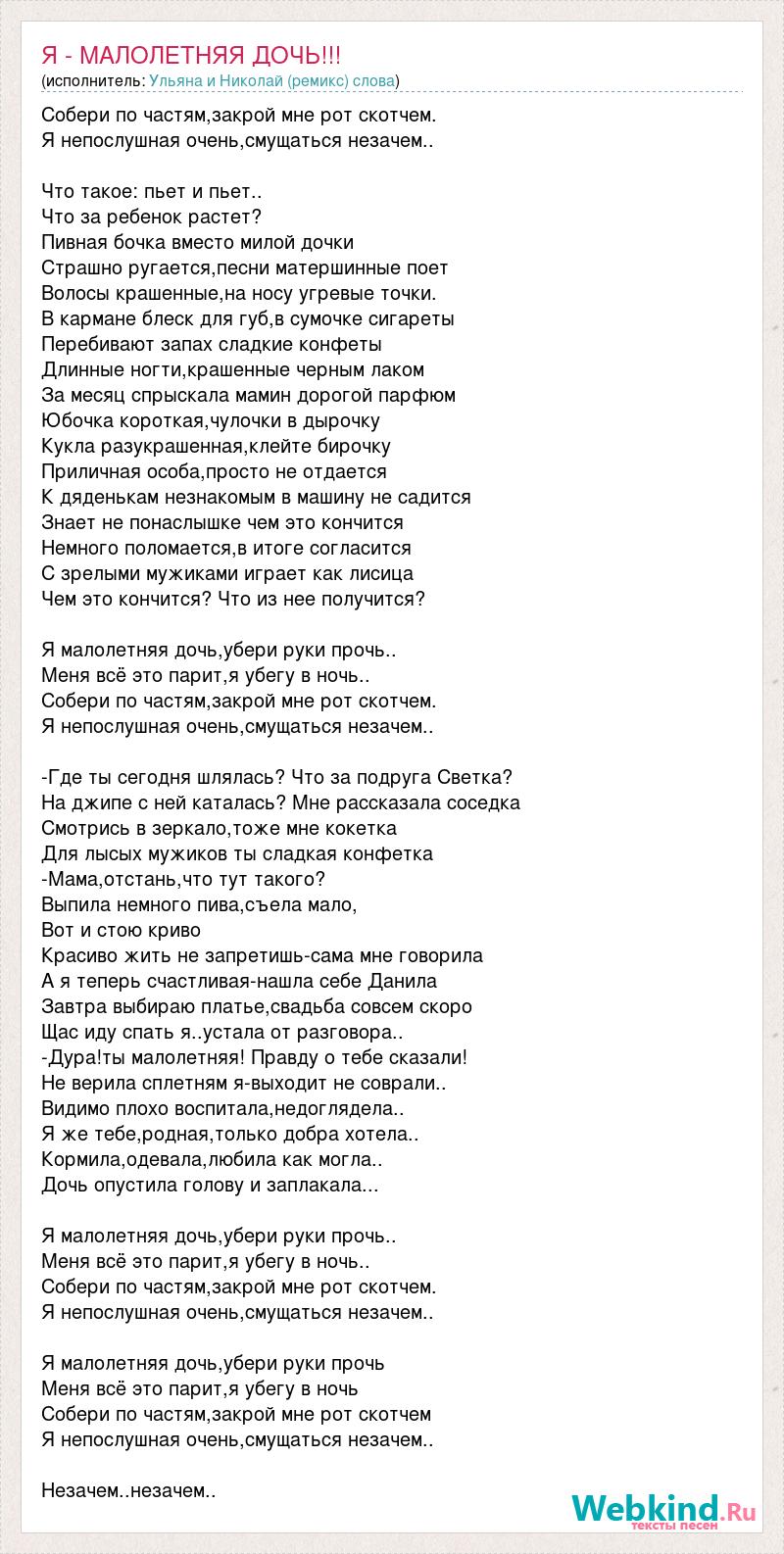 Собери по частям,закрой мне рот скотчем. Я непослушная очень,смущаться незачем.. Что такое: пьет и пьет.. Что за ребенок растет? Пивная бочка вместо милой дочки Страшно ругается,песни матершинные поет Волосы крашенные,на носу угревые точки. В кармане блеск для губ,в сумочке сигареты Перебивают запах сладкие конфеты Длинные ногти,крашенные черным лаком За месяц спрыскала мамин дорогой парфюм Юбочка короткая,чулочки в дырочку Кукла разукрашенная,клейте бирочку Приличная особа,просто не отдается К дяденькам незнакомым в машину не садится Знает не понаслышке чем это кончится Немного поломается,в итоге согласится С зрелыми мужиками играет как лисица Чем это кончится? Что из нее получится? Я малолетняя дочь,убери руки прочь.. Меня всё это парит,я убегу в ночь.. Собери по частям,закрой мне рот скотчем. Я непослушная очень,смущаться незачем.. -Где ты сегодня шлялась? Что за подруга Светка? На джипе с ней каталась? Мне рассказала соседка Смотрись в зеркало,тоже мне кокетка Для лысых мужиков ты сладкая конфетка -Мама,отстань,что тут такого? Выпила немного пива,съела мало, Вот и стою криво Красиво жить не запретишь-сама мне говорила А я теперь счастливая-нашла себе Данила Завтра выбираю платье,свадьба совсем скоро Щас иду спать я..устала от разговора.. -Дура!ты малолетняя! Правду о тебе сказали! Не верила сплетням я-выходит не соврали.. Видимо плохо воспитала,недоглядела.. Я же тебе,родная,только добра хотела.. Кормила,одевала,любила как могла.. Дочь опустила голову и заплакала... Я малолетняя дочь,убери руки прочь.. Меня всё это парит,я убегу в ночь.. Собери по частям,закрой мне рот скотчем. Я непослушная очень,смущаться незачем.. Я малолетняя дочь,убери руки прочь Меня всё это парит,я убегу в ночь Собери по частям,закрой мне рот скотчем Я непослушная очень,смущаться незачем.. Незачем..незачем..