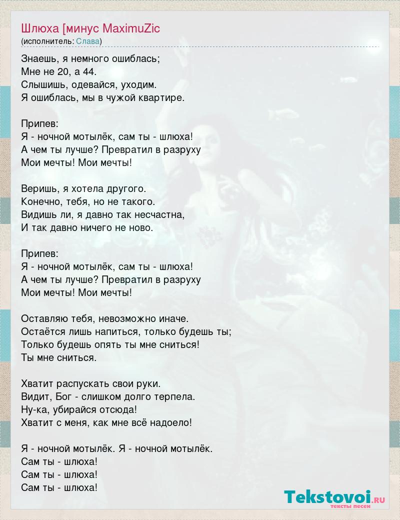 Знаешь, я немного ошиблась; Мне не 20, а 44. Слышишь, одевайся, уходим. Я ошиблась, мы в чужой квартире. Припев: Я - ночной мотылёк, сам ты - шлюха! А чем ты лучше? Превратил в разруху Мои мечты! Мои мечты! Веришь, я хотела другого. Конечно, тебя, но не такого. Видишь ли, я давно так несчастна, И так давно ничего не ново. Припев: Я - ночной мотылёк, сам ты - шлюха! А чем ты лучше? Превратил в разруху Мои мечты! Мои мечты! Оставляю тебя, невозможно иначе. Остаётся лишь напиться, только будешь ты; Только будешь опять ты мне сниться! Ты мне сниться. Хватит распускать свои руки. Видит, Бог - слишком долго терпела. Ну-ка, убирайся отсюда! Хватит с меня, как мне всё надоело! Я - ночной мотылёк. Я - ночной мотылёк. Сам ты - шлюха! Сам ты - шлюха! Сам ты - шлюха!