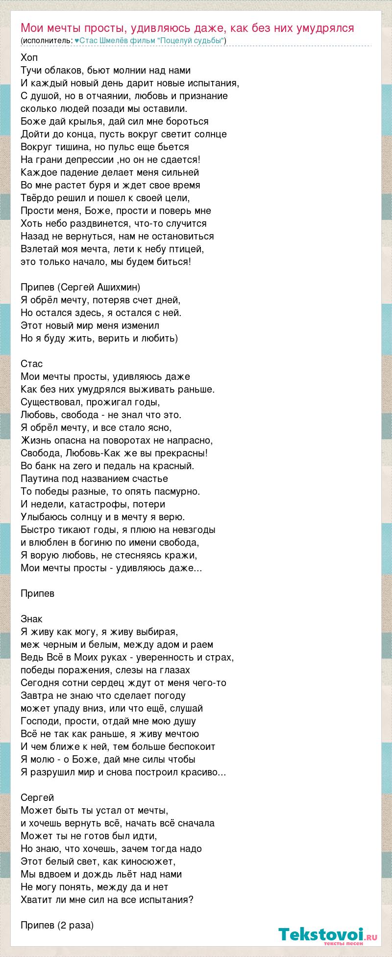 Хоп Тучи облаков, бьют молнии над нами И каждый новый день дарит новые испытания, С душой, но в отчаянии, любовь и признание сколько людей позади мы оставили. Боже дай крылья, дай сил мне бороться Дойти до конца, пусть вокруг светит солнце Вокруг тишина, но пульс еще бьется На грани депрессии ,но он не сдается! Каждое падение делает меня сильней Во мне растет буря и ждет свое время Твёрдо решил и пошел к своей цели, Прости меня, Боже, прости и поверь мне Хоть небо раздвинется, что-то случится Назад не вернуться, нам не остановиться Взлетай моя мечта, лети к небу птицей, это только начало, мы будем биться! Припев (Сергей Ашихмин) Я обрёл мечту, потеряв счет дней, Но остался здесь, я остался с ней. Этот новый мир меня изменил Но я буду жить, верить и любить) Стас Мои мечты просты, удивляюсь даже Как без них умудрялся выживать раньше. Существовал, прожигал годы, Любовь, свобода - не знал что это. Я обрёл мечту, и все стало ясно, Жизнь опасна на поворотах не напрасно, Свобода, Любовь-Как же вы прекрасны! Во банк на zero и педаль на красный. Паутина под названием счастье То победы разные, то опять пасмурно. И недели, катастрофы, потери Улыбаюсь солнцу и в мечту я верю. Быстро тикают годы, я плюю на невзгоды и влюблен в богиню по имени свобода, Я ворую любовь, не стесняясь кражи, Мои мечты просты - удивляюсь даже... Припев Знак Я живу как могу, я живу выбирая, меж черным и белым, между адом и раем Ведь Всё в Моих руках - уверенность и страх, победы поражения, слезы на глазах Сегодня сотни сердец ждут от меня чего-то Завтра не знаю что сделает погоду может упаду вниз, или что ещё, слушай Господи, прости, отдай мне мою душу Всё не так как раньше, я живу мечтою И чем ближе к ней, тем больше беспокоит Я молю - о Боже, дай мне силы чтобы Я разрушил мир и снова построил красиво... Сергей Может быть ты устал от мечты, и хочешь вернуть всё, начать всё сначала Может ты не готов был идти, Но знаю, что хочешь, зачем тогда надо Этот белый свет, как киносюжет, Мы вдвоем и дождь льёт над нами Не могу понять, между да и нет Хватит ли мне сил на все испытания? Припев (2 раза)