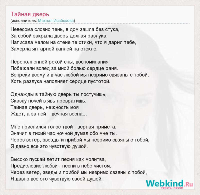 Невесома словно тень, в дом зашла без стука, За собой закрыла дверь долгая разлука. Написала мелом на стене те стихи, что я дарил тебе, Замерла янтарной каплей на стекле. Переполненной рекой сны, воспоминания Побежали вслед за мной болью сердце раня. Вопреки всему и в час любой мы незримо связаны с тобой, Хоть разлука наполняет сердце пустотой. Однажды в тайную дверь ты постучишь, Сказку ночей в явь превратишь. Тайная дверь, нежность моя Ждет, а за ней – вечная весна... Мне приснился голос твой - верная примета. Значит в тихий час ночной думал обо мне ты. Через ветер, звезды и прибой мы незримо свзяны с тобой, Я давно все это чувствую душой. Высоко пускай летит песня как молитва, Предисловие любви - песни в небе чистом. Через ветер, зведы и прибой мы незримо свзяны с тобой, Я давно все это чувствую своей душой.