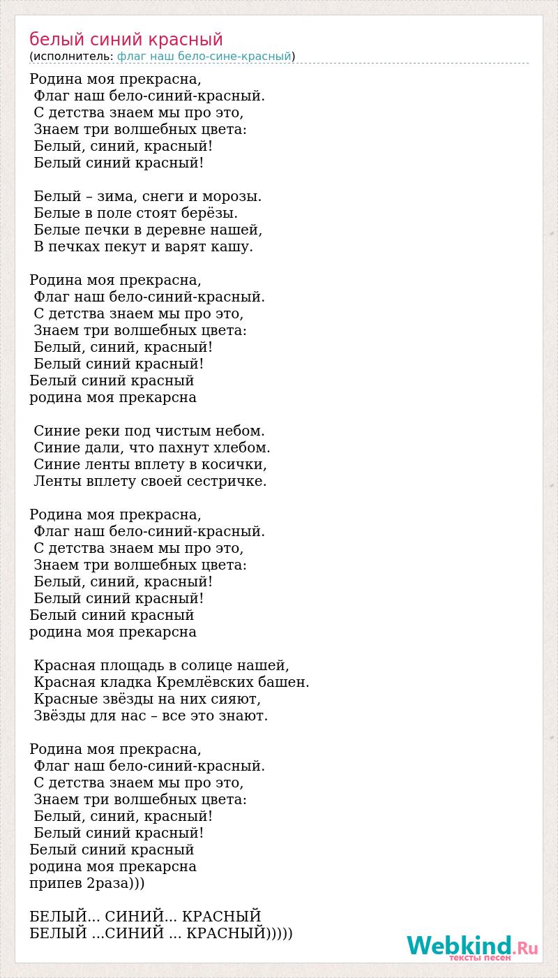 Родина моя прекрасна, Флаг наш бело-синий-красный. С детства знаем мы про это, Знаем три волшебных цвета: Белый, синий, красный! Белый синий красный! Белый – зима, снеги и морозы. Белые в поле стоят берёзы. Белые печки в деревне нашей, В печках пекут и варят кашу. Родина моя прекрасна, Флаг наш бело-синий-красный. С детства знаем мы про это, Знаем три волшебных цвета: Белый, синий, красный! Белый синий красный! Белый синий красный родина моя прекарсна Синие реки под чистым небом. Синие дали, что пахнут хлебом. Синие ленты вплету в косички, Ленты вплету своей сестричке. Родина моя прекрасна, Флаг наш бело-синий-красный. С детства знаем мы про это, Знаем три волшебных цвета: Белый, синий, красный! Белый синий красный! Белый синий красный родина моя прекарсна Красная площадь в солице нашей, Красная кладка Кремлёвских башен. Красные звёзды на них сияют, Звёзды для нас – все это знают. Родина моя прекрасна, Флаг наш бело-синий-красный. С детства знаем мы про это, Знаем три волшебных цвета: Белый, синий, красный! Белый синий красный! Белый синий красный родина моя прекарсна припев 2раза))) БЕЛЫЙ... СИНИЙ... КРАСНЫЙ БЕЛЫЙ ...СИНИЙ ... КРАСНЫЙ)))))