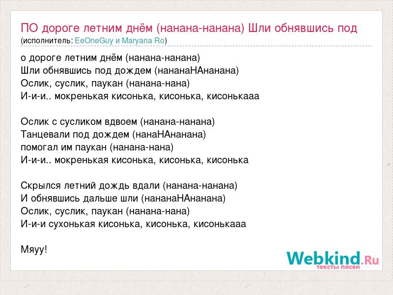 о дороге летним днём (нанана-нанана) Шли обнявшись под дождем (нананаНАнанана) Ослик, суслик, паукан (нанана-нана) И-и-и.. мокренькая кисонька, кисонька, кисонькааа Ослик с сусликом вдвоем (нанана-нанана) Танцевали под дождем (нанаНАнанана) помогал им паукан (нанана-нана) И-и-и.. мокренькая кисонька, кисонька, кисонька Скрылся летний дождь вдали (нанана-нанана) И обнявшись дальше шли (нананаНАнанана) Ослик, суслик, паукан (нанана-нана) И-и-и сухонькая кисонька, кисонька, кисонькааа Мяуу!