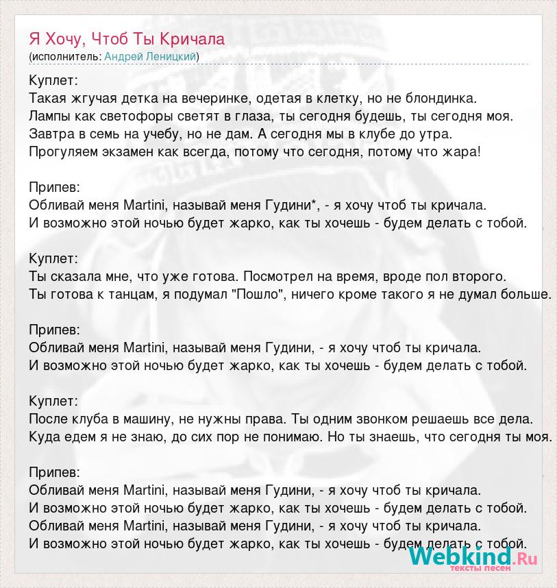 Куплет: Такая жгучая детка на вечеринке, одетая в клетку, но не блондинка. Лампы как светофоры светят в глаза, ты сегодня будешь, ты сегодня моя. Завтра в семь на учебу, но не дам. А сегодня мы в клубе до утра. Прогуляем экзамен как всегда, потому что сегодня, потому что жара! Припев: Обливай меня Martini, называй меня Гудини*, - я хочу чтоб ты кричала. И возможно этой ночью будет жарко, как ты хочешь - будем делать с тобой. Куплет: Ты сказала мне, что уже готова. Посмотрел на время, вроде пол второго. Ты готова к танцам, я подумал "Пошло", ничего кроме такого я не думал больше. Припев: Обливай меня Martini, называй меня Гудини, - я хочу чтоб ты кричала. И возможно этой ночью будет жарко, как ты хочешь - будем делать с тобой. Куплет: После клуба в машину, не нужны права. Ты одним звонком решаешь все дела. Куда едем я не знаю, до сих пор не понимаю. Но ты знаешь, что сегодня ты моя. Припев: Обливай меня Martini, называй меня Гудини, - я хочу чтоб ты кричала. И возможно этой ночью будет жарко, как ты хочешь - будем делать с тобой. Обливай меня Martini, называй меня Гудини, - я хочу чтоб ты кричала. И возможно этой ночью будет жарко, как ты хочешь - будем делать с тобой.