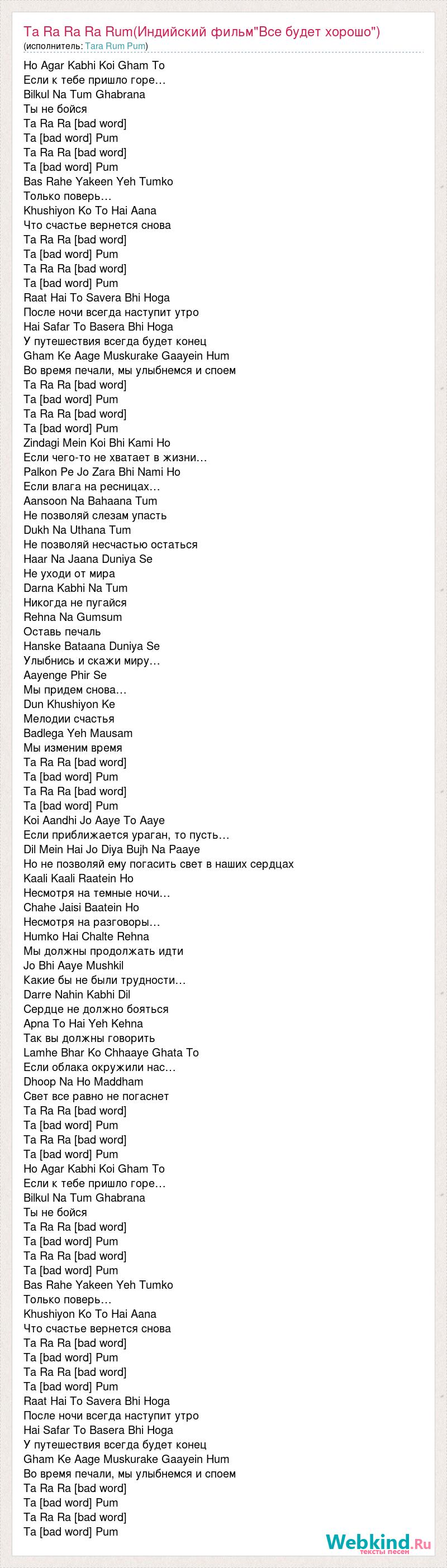 Ho Agar Kabhi Koi Gham To Если к тебе пришло горе… Bilkul Na Tum Ghabrana Ты не бойся Ta Ra Ra [bad word] Ta [bad word] Pum Ta Ra Ra [bad word] Ta [bad word] Pum Bas Rahe Yakeen Yeh Tumko Только поверь… Khushiyon Ko To Hai Aana Что счастье вернется снова Ta Ra Ra [bad word] Ta [bad word] Pum Ta Ra Ra [bad word] Ta [bad word] Pum Raat Hai To Savera Bhi Hoga После ночи всегда наступит утро Hai Safar To Basera Bhi Hoga У путешествия всегда будет конец Gham Ke Aage Muskurake Gaayein Hum Во время печали, мы улыбнемся и споем Ta Ra Ra [bad word] Ta [bad word] Pum Ta Ra Ra [bad word] Ta [bad word] Pum Zindagi Mein Koi Bhi Kami Ho Если чего-то не хватает в жизни… Palkon Pe Jo Zara Bhi Nami Ho Если влага на ресницах… Aansoon Na Bahaana Tum Не позволяй слезам упасть Dukh Na Uthana Tum Не позволяй несчастью остаться Haar Na Jaana Duniya Se Не уходи от мира Darna Kabhi Na Tum Никогда не пугайся Rehna Na Gumsum Оставь печаль Hanske Bataana Duniya Se Улыбнись и скажи миру… Aayenge Phir Se Мы придем снова… Dun Khushiyon Ke Мелодии счастья Badlega Yeh Mausam Мы изменим время Ta Ra Ra [bad word] Ta [bad word] Pum Ta Ra Ra [bad word] Ta [bad word] Pum Koi Aandhi Jo Aaye To Aaye Если приближается ураган, то пусть… Dil Mein Hai Jo Diya Bujh Na Paaye Но не позволяй ему погасить свет в наших сердцах Kaali Kaali Raatein Ho Несмотря на темные ночи… Chahe Jaisi Baatein Ho Несмотря на разговоры… Humko Hai Chalte Rehna Мы должны продолжать идти Jo Bhi Aaye Mushkil Какие бы не были трудности… Darre Nahin Kabhi Dil Сердце не должно бояться Apna To Hai Yeh Kehna Так вы должны говорить Lamhe Bhar Ko Chhaaye Ghata To Если облака окружили нас… Dhoop Na Ho Maddham Свет все равно не погаснет Ta Ra Ra [bad word] Ta [bad word] Pum Ta Ra Ra [bad word] Ta [bad word] Pum Ho Agar Kabhi Koi Gham To Если к тебе пришло горе… Bilkul Na Tum Ghabrana Ты не бойся Ta Ra Ra [bad word] Ta [bad word] Pum Ta Ra Ra [bad word] Ta [bad word] Pum Bas Rahe Yakeen Yeh Tumko Только поверь… Khushiyon Ko To Hai Aana Что счастье вернется снова Ta Ra Ra [bad word] Ta [bad word] Pum Ta Ra Ra [bad word] Ta [bad word] Pum Raat Hai To Savera Bhi Hoga После ночи всегда наступит утро Hai Safar To Basera Bhi Hoga У путешествия всегда будет конец Gham Ke Aage Muskurake Gaayein Hum Во время печали, мы улыбнемся и споем Ta Ra Ra [bad word] Ta [bad word] Pum Ta Ra Ra [bad word] Ta [bad word] Pum