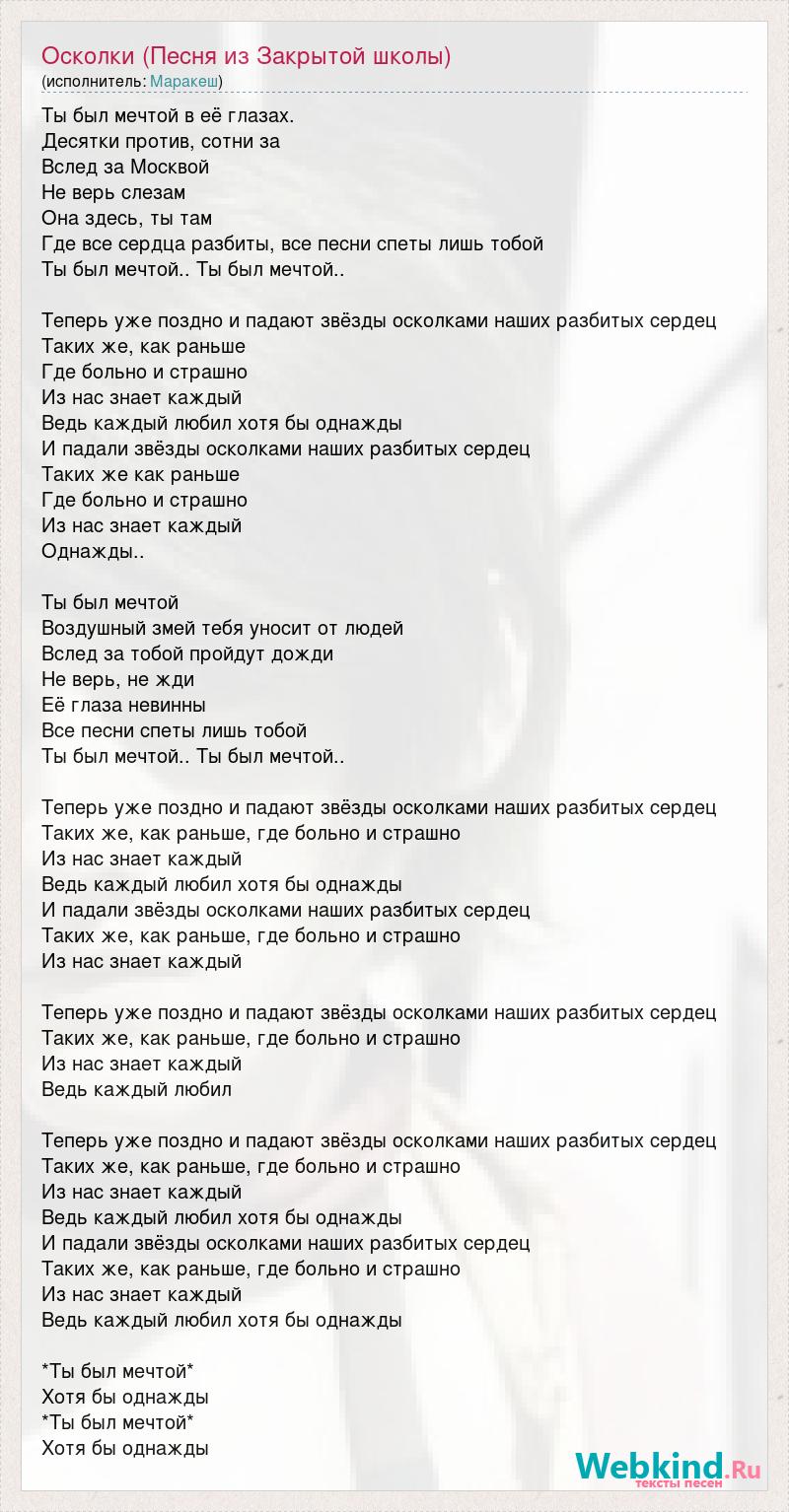Ты был мечтой в её глазах. Десятки против, сотни за Вслед за Москвой Не верь слезам Она здесь, ты там Где все сердца разбиты, все песни спеты лишь тобой Ты был мечтой.. Ты был мечтой.. Теперь уже поздно и падают звёзды осколками наших разбитых сердец Таких же, как раньше Где больно и страшно Из нас знает каждый Ведь каждый любил хотя бы однажды И падали звёзды осколками наших разбитых сердец Таких же как раньше Где больно и страшно Из нас знает каждый Однажды.. Ты был мечтой Воздушный змей тебя уносит от людей Вслед за тобой пройдут дожди Не верь, не жди Её глаза невинны Все песни спеты лишь тобой Ты был мечтой.. Ты был мечтой.. Теперь уже поздно и падают звёзды осколками наших разбитых сердец Таких же, как раньше, где больно и страшно Из нас знает каждый Ведь каждый любил хотя бы однажды И падали звёзды осколками наших разбитых сердец Таких же, как раньше, где больно и страшно Из нас знает каждый Теперь уже поздно и падают звёзды осколками наших разбитых сердец Таких же, как раньше, где больно и страшно Из нас знает каждый Ведь каждый любил Теперь уже поздно и падают звёзды осколками наших разбитых сердец Таких же, как раньше, где больно и страшно Из нас знает каждый Ведь каждый любил хотя бы однажды И падали звёзды осколками наших разбитых сердец Таких же, как раньше, где больно и страшно Из нас знает каждый Ведь каждый любил хотя бы однажды *Ты был мечтой* Хотя бы однажды *Ты был мечтой* Хотя бы однажды