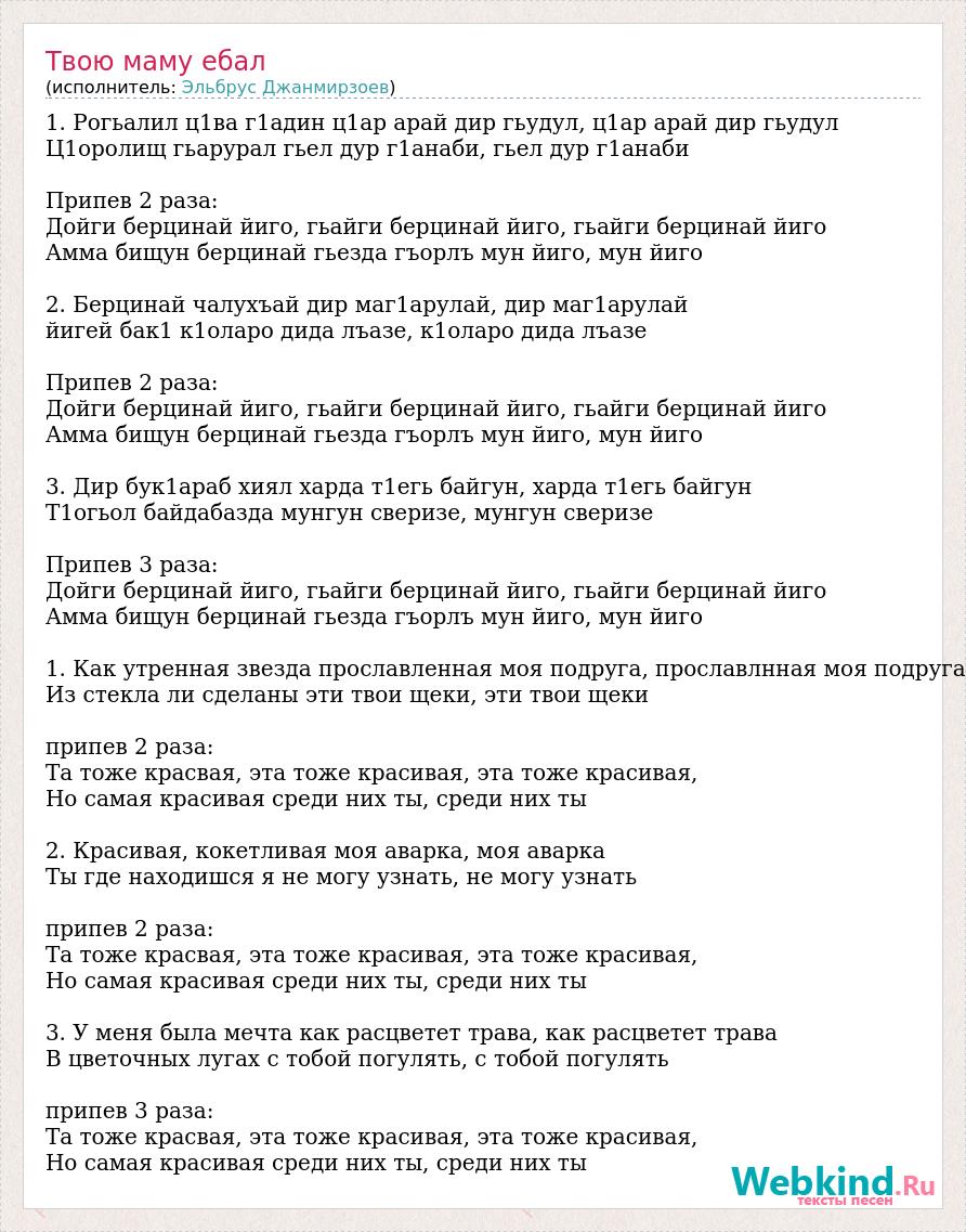 1. Рогьалил ц1ва г1адин ц1ар арай дир гьудул, ц1ар арай дир гьудул Ц1оролищ гьарурал гьел дур г1анаби, гьел дур г1анаби Припев 2 раза: Дойги берцинай йиго, гьайги берцинай йиго, гьайги берцинай йиго Амма бищун берцинай гьезда гъорлъ мун йиго, мун йиго 2. Берцинай чалухъай дир маг1арулай, дир маг1арулай йигей бак1 к1оларо дида лъазе, к1оларо дида лъазе Припев 2 раза: Дойги берцинай йиго, гьайги берцинай йиго, гьайги берцинай йиго Амма бищун берцинай гьезда гъорлъ мун йиго, мун йиго 3. Дир бук1араб хиял харда т1егь байгун, харда т1егь байгун Т1огьол байдабазда мунгун сверизе, мунгун сверизе Припев 3 раза: Дойги берцинай йиго, гьайги берцинай йиго, гьайги берцинай йиго Амма бищун берцинай гьезда гъорлъ мун йиго, мун йиго 1. Как утренная звезда прославленная моя подруга, прославлнная моя подруга Из стекла ли сделаны эти твои щеки, эти твои щеки припев 2 раза: Та тоже красвая, эта тоже красивая, эта тоже красивая, Но самая красивая среди них ты, среди них ты 2. Красивая, кокетливая моя аварка, моя аварка Ты где находишся я не могу узнать, не могу узнать припев 2 раза: Та тоже красвая, эта тоже красивая, эта тоже красивая, Но самая красивая среди них ты, среди них ты 3. У меня была мечта как расцветет трава, как расцветет трава В цветочных лугах с тобой погулять, с тобой погулять припев 3 раза: Та тоже красвая, эта тоже красивая, эта тоже красивая, Но самая красивая среди них ты, среди них ты