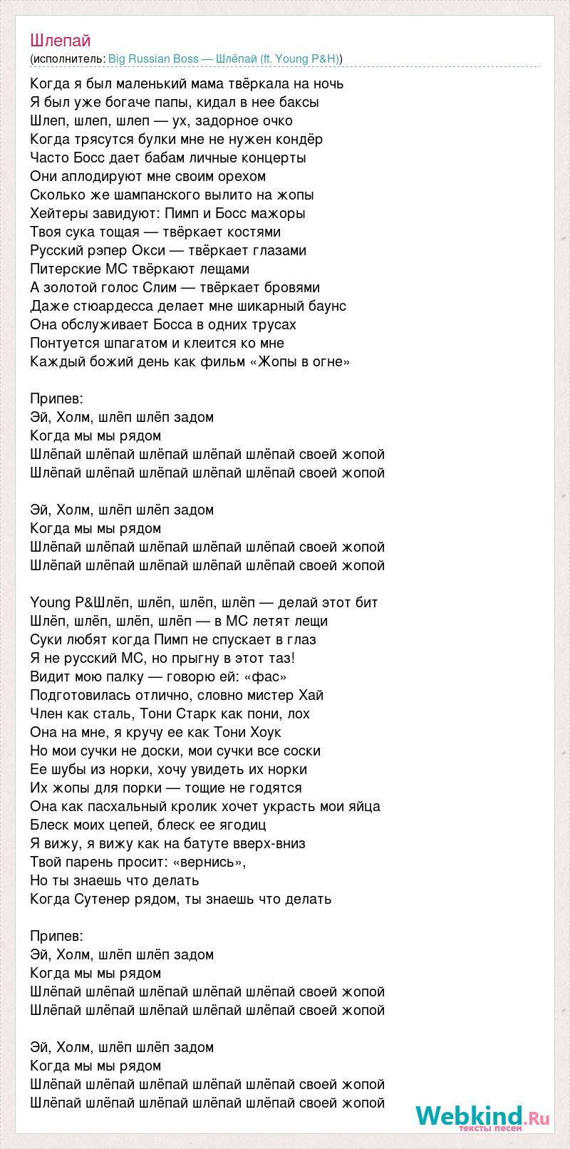 Когда я был маленький мама твёркала на ночь Я был уже богаче папы, кидал в нее баксы Шлеп, шлеп, шлеп — ух, задорное очко Когда трясутся булки мне не нужен кондёр Часто Босс дает бабам личные концерты Они аплодируют мне своим орехом Сколько же шампанского вылито на жопы Хейтеры завидуют: Пимп и Босс мажоры Твоя сука тощая — твёркает костями Русский рэпер Окси — твёркает глазами Питерские МС твёркают лещами А золотой голос Слим — твёркает бровями Даже стюардесса делает мне шикарный баунс Она обслуживает Босса в одних трусах Понтуется шпагатом и клеится ко мне Каждый божий день как фильм «Жопы в огне» Припев: Эй, Холм, шлёп шлёп задом Когда мы мы рядом Шлёпай шлёпай шлёпай шлёпай шлёпай своей жопой Шлёпай шлёпай шлёпай шлёпай шлёпай своей жопой Эй, Холм, шлёп шлёп задом Когда мы мы рядом Шлёпай шлёпай шлёпай шлёпай шлёпай своей жопой Шлёпай шлёпай шлёпай шлёпай шлёпай своей жопой Young P&Шлёп, шлёп, шлёп, шлёп — делай этот бит Шлёп, шлёп, шлёп, шлёп — в МС летят лещи Суки любят когда Пимп не спускает в глаз Я не русский МС, но прыгну в этот таз! Видит мою палку — говорю ей: «фас» Подготовилась отлично, словно мистер Хай Член как сталь, Тони Старк как пони, лох Она на мне, я кручу ее как Тони Хоук Но мои сучки не доски, мои сучки все соски Ее шубы из норки, хочу увидеть их норки Их жопы для порки — тощие не годятся Она как пасхальный кролик хочет украсть мои яйца Блеск моих цепей, блеск ее ягодиц Я вижу, я вижу как на батуте вверх-вниз Твой парень просит: «вернись», Но ты знаешь что делать Когда Сутенер рядом, ты знаешь что делать Припев: Эй, Холм, шлёп шлёп задом Когда мы мы рядом Шлёпай шлёпай шлёпай шлёпай шлёпай своей жопой Шлёпай шлёпай шлёпай шлёпай шлёпай своей жопой Эй, Холм, шлёп шлёп задом Когда мы мы рядом Шлёпай шлёпай шлёпай шлёпай шлёпай своей жопой Шлёпай шлёпай шлёпай шлёпай шлёпай своей жопой