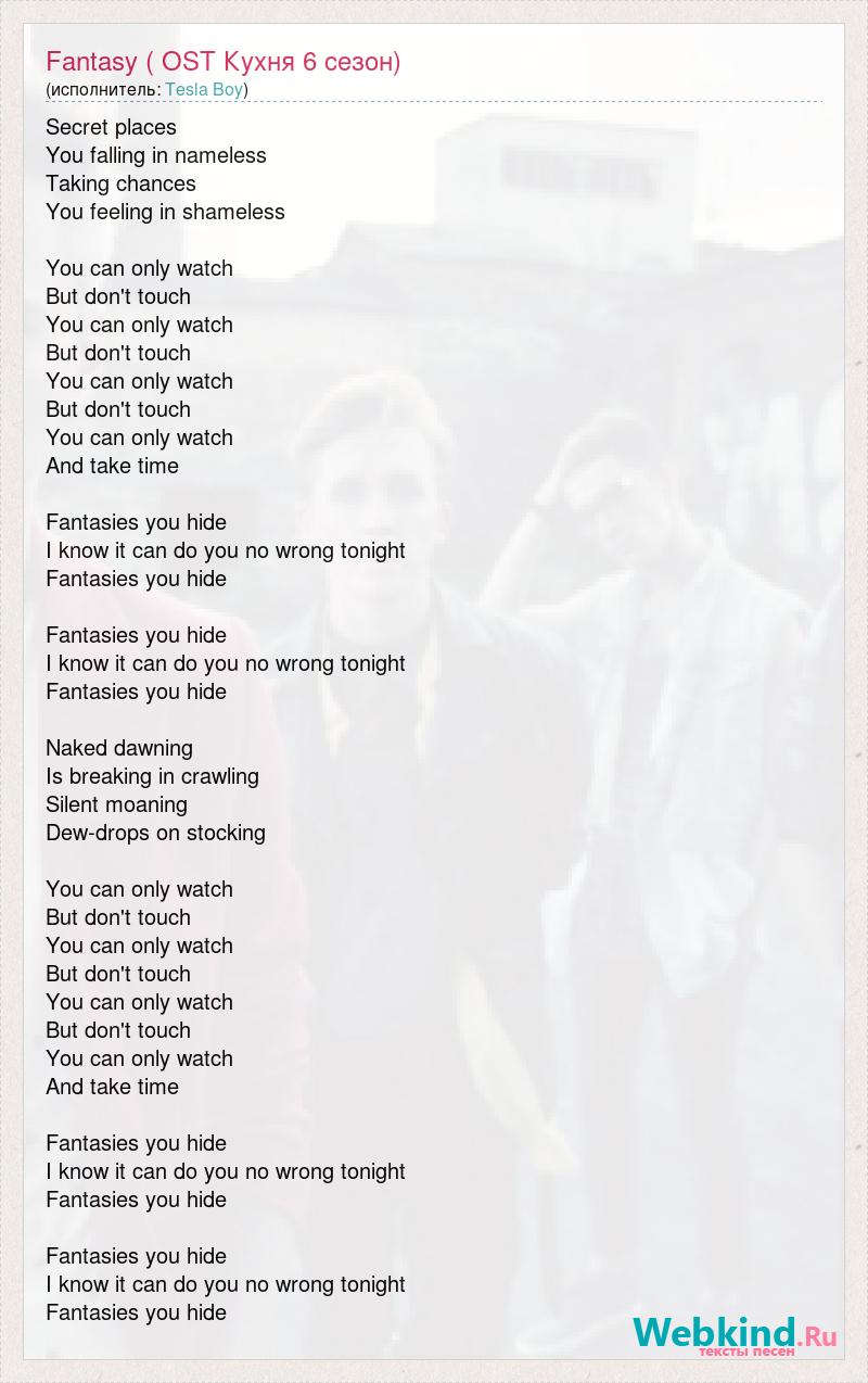 Secret places You falling in nameless Taking chances You feeling in shameless You can only watch But don't touch You can only watch But don't touch You can only watch But don't touch You can only watch And take time Fantasies you hide I know it can do you no wrong tonight Fantasies you hide Fantasies you hide I know it can do you no wrong tonight Fantasies you hide Naked dawning Is breaking in crawling Silent moaning Dew-drops on stocking You can only watch But don't touch You can only watch But don't touch You can only watch But don't touch You can only watch And take time Fantasies you hide I know it can do you no wrong tonight Fantasies you hide Fantasies you hide I know it can do you no wrong tonight Fantasies you hide