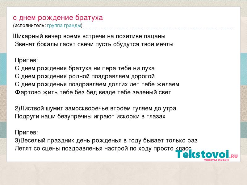 Шикарный вечер время встречи на позитиве пацаны Звенят бокалы гасят свечи пусть сбудутся твои мечты Припев: С днем рождения братуха ни пера тебе ни пуха С днем рождения родной поздравляем дорогой С днем рожденья поздравляем долгих лет тебе желаем Фартово жить тебе без бед везде тебе зеленый свет 2)Листвой шумит замоскворечье втроем гуляем до утра Подруги наши безупречны играют искорки в глазах Припев: 3)Веселый праздник день рожденья в году бывает только раз Летят со сцены поздравленья настрой по ходу просто класс