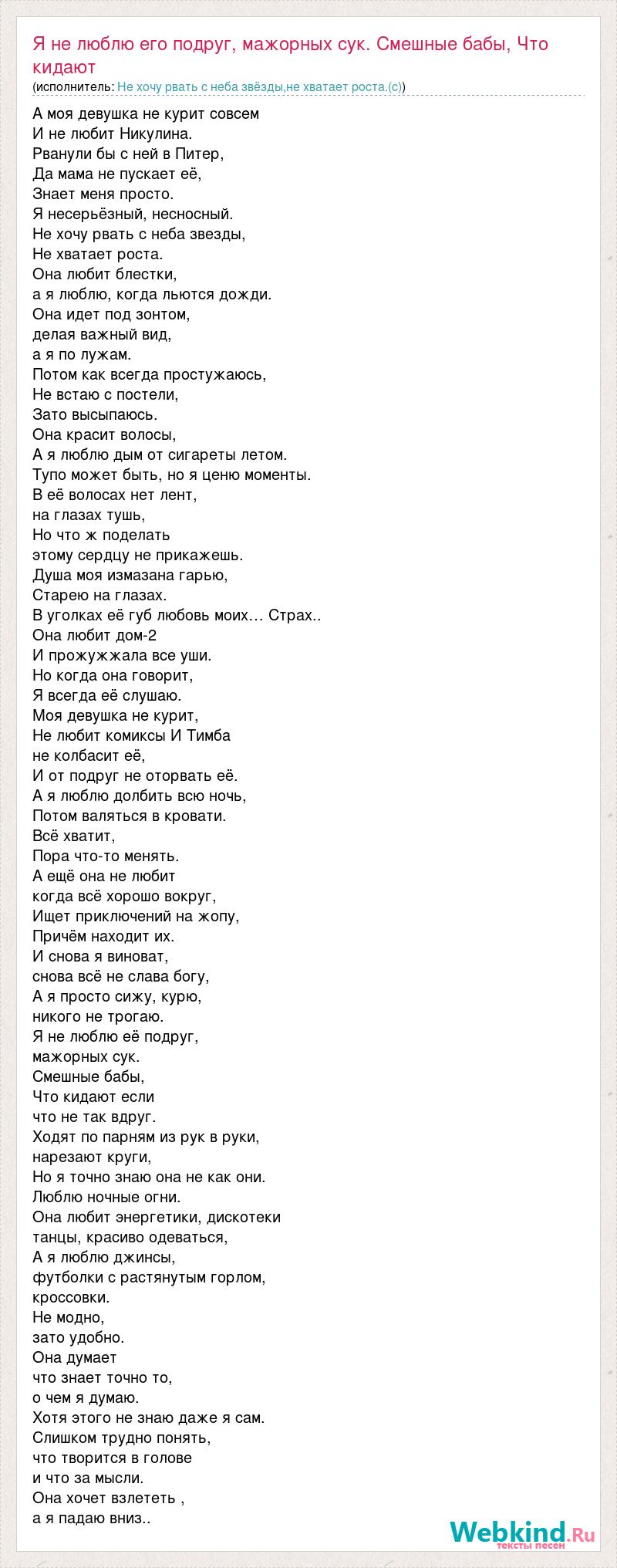 Главная→Исполнители→Не хочу рвать с неба звёзды,не хватает роста.(с)→Я не люблю его подруг, мажорных сук. Смешные бабы, Что кидают если что не так
